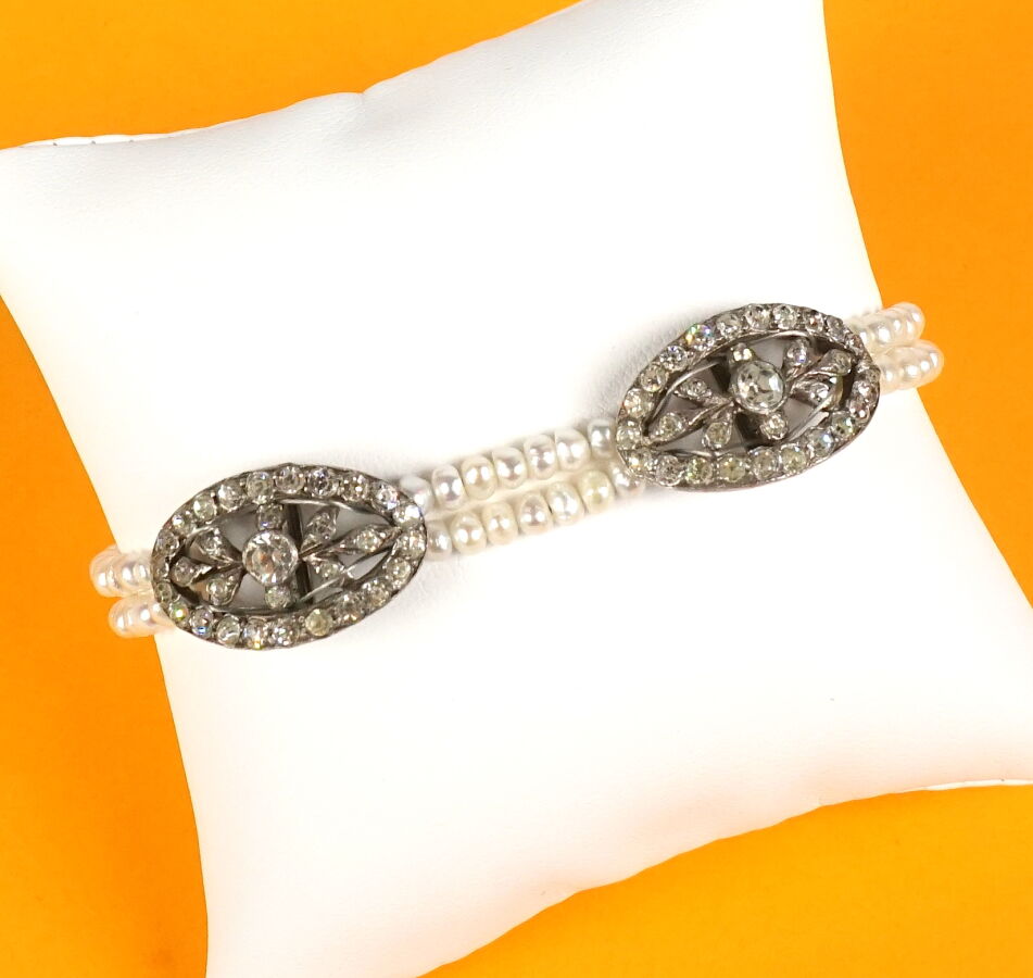 Bracelet "Double rang" en argent (800/oo), agrémenté de 3 x 2 rangs de perles, alternés de 2 motifs ovales sertis de strass, fermoir boule à cliquet retenant une croix, L. 18 cm (probable remontage à partir d'éléments anciens). Poids brut : 11.9 g environ.