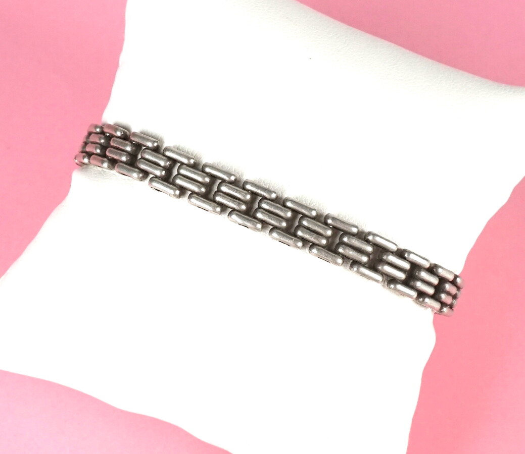 Bracelet en argent (925/oo), maille grain de riz, fermoir à cliquet avec chaine et 8 de sécurité, L. 16.5 cm. Poids brut : 14.7 g environ.
