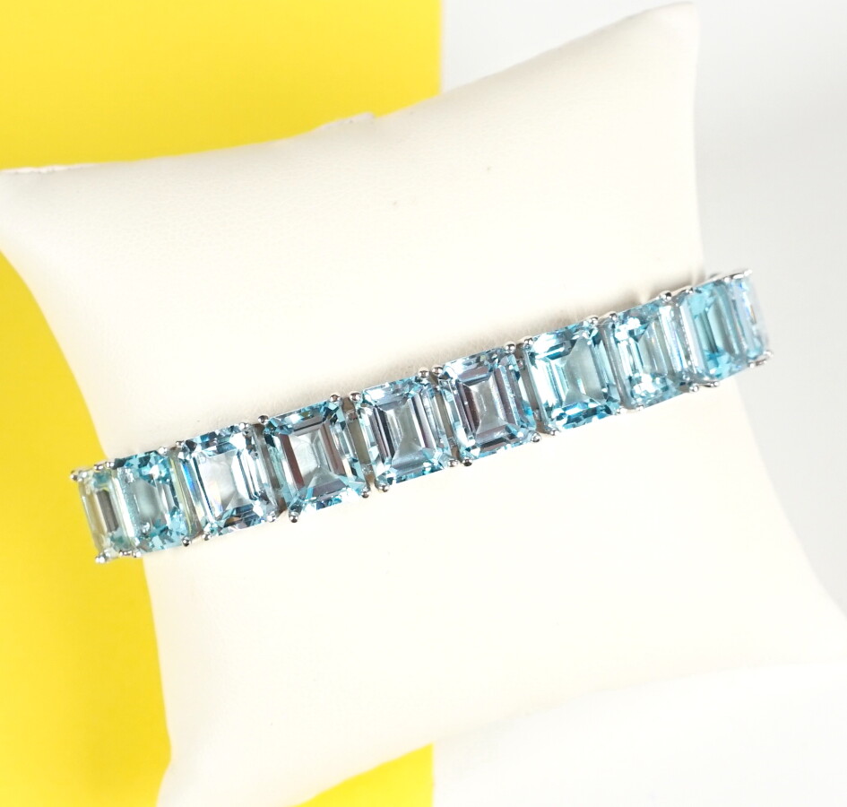 Bracelet en argent (925/oo) serti de 20 topazes bleues taille rectangulaire, pesant ensemble 50 cts, fermoir à cliquet avec 8 de sécurité, L. 18 cm. Poids brut : 35.7 g environ.