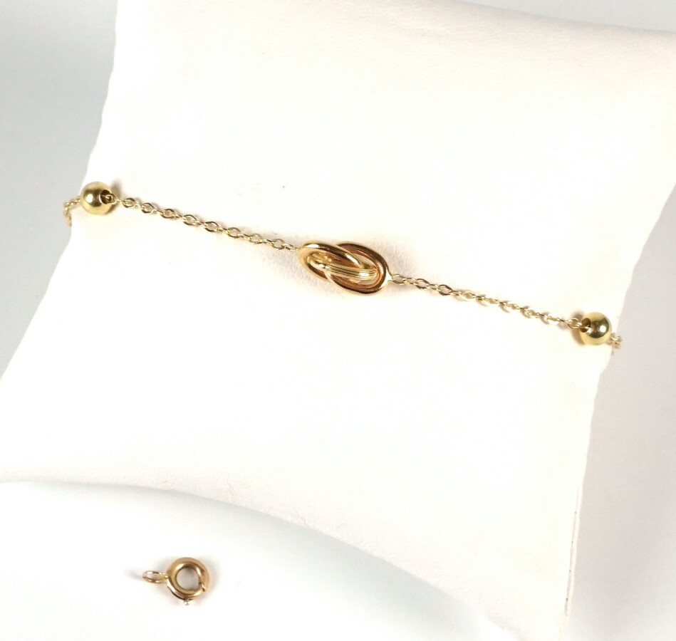 Bracelet en or jaune 18 K (750/oo) chaine maille forçat ornée de boules d'or et d'un motif de 3 anneaux ovales entrelacés, L. 18.5 cm. Poids brut : 1.2 g environ.