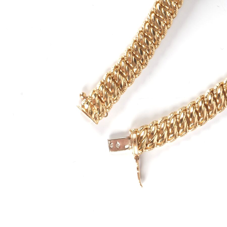 Bracelet en or jaune 18K (750/oo), maille américaine, fermoir à cliquet et 8 de sécurité, L. 18.5 cm. L. Totale : 19.1 cm. Larg. 7 mm. Poids brut : 13.5 g environ.