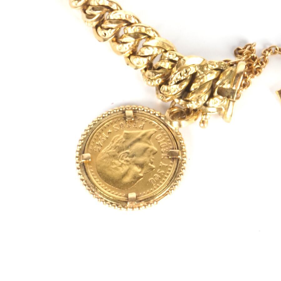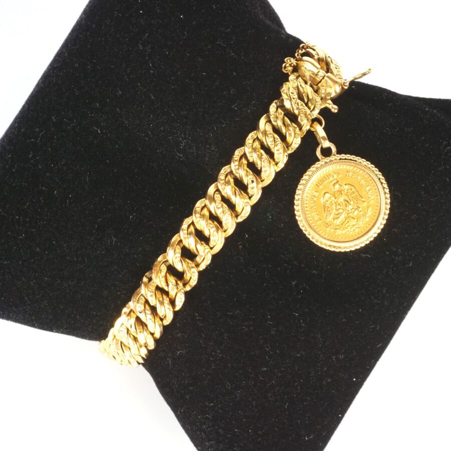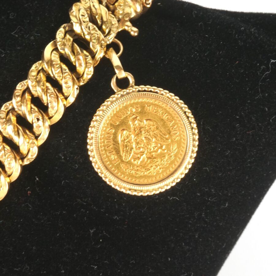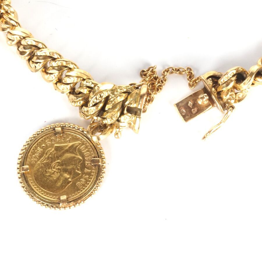Bracelet en or jaune 18K (750/oo), maille américaine, retenant une monnaie Dos y medio pesos de 1945 formant pendeloque en serti griffe, fermoir à cliquet avec 8 de sécurité et chaîne de sécurité, L. Tour de poignet : 8.5 cm environ. Larg. 9 mm. Poids brut : 16.9 g environ.