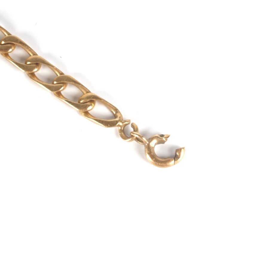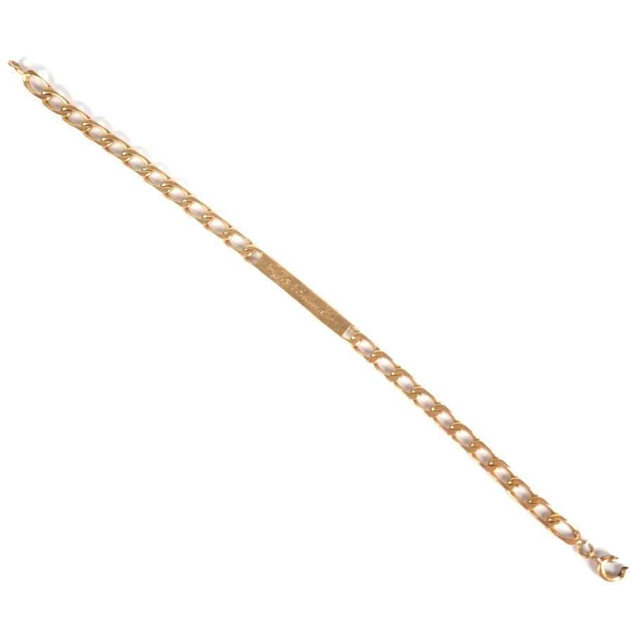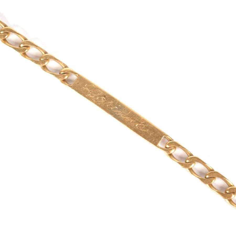 Bracelet en or jaune 18K (750/oo), maille gourmette, plaque rectangulaire portant l'inscription "Corinne", fermoir à anneau ressort (accidenté), L. 18.3 cm. Larg. 4 mm. Poids brut : 9 g environ.