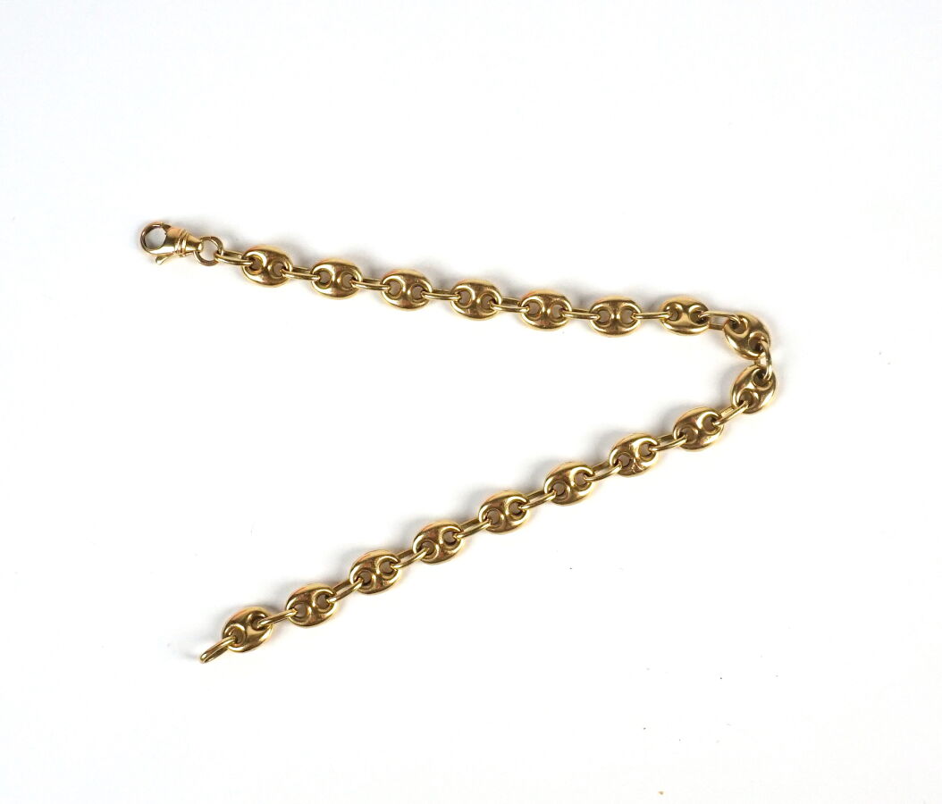 Bracelet en or jaune 18K (750/oo), maille grains de café, fermoir mousqueton, L. 19 cm. Poids brut : 9.1 g environ.