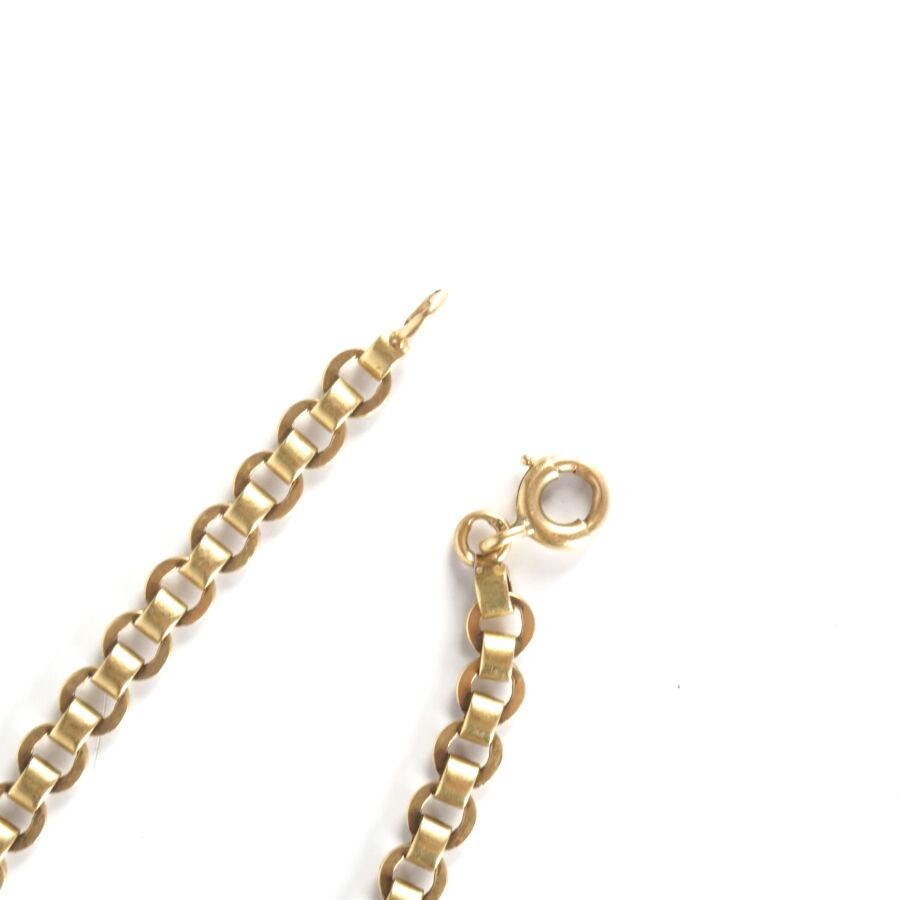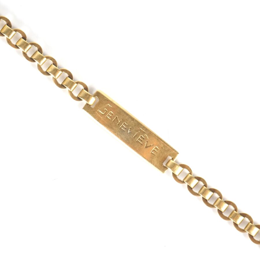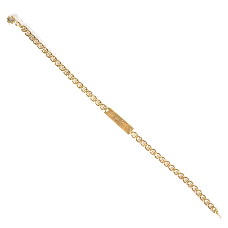 Bracelet en or jaune 18K (750/oo), maille plate style jaseron, plaque rectangulaire portant l'inscription gravée "Geneviève", fermoir à anneau ressort, L. 20.3 cm. Larg. 6 mm. Poids brut : 7.7 g environ.