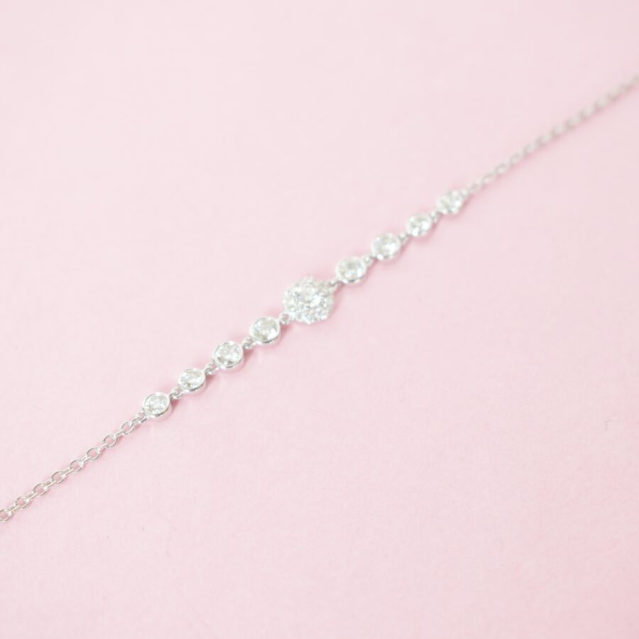 Bracelet "Fleurette" en or blanc 18K (750/oo), serti de dix-huit diamants blancs taille moderne pour 0.4 ct environ, fermoir mousqueton, Longueur : 15.5 à 17.5 cm, Poids brut : 2.1 g environ.