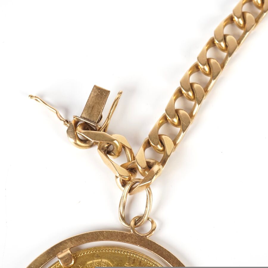 Bracelet "Gourmette" en or jaune 18K (750/oo), retenant une importante breloque sertie d'une monnaie or 4 Ducats François Joseph Ier Empereur d'*Autriche 1915, fermoir à cliquet avec deux 8 de sécurité, L. 18 cm. Poids brut : 55.1 g environ.