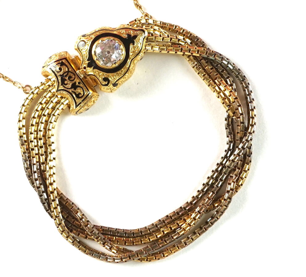 Bracelet "Multi rangs" en or jaune 18K (750oo), formé de 4 chaines style maille vénitienne, agrémenté d'un motif de cartouche à décor feuillagé ciselé, souligné d'émail noir, et serti d'un diamant taille ancienne calibrant 0.6 carat environ (égrisure), fermoir à cliquet, chaine de sûreté probablement rapportée, L. 14.5 cm. Poids brut : 13.9 g environ.