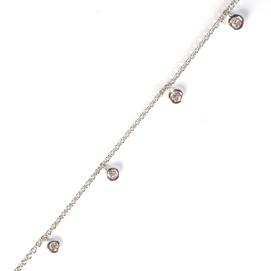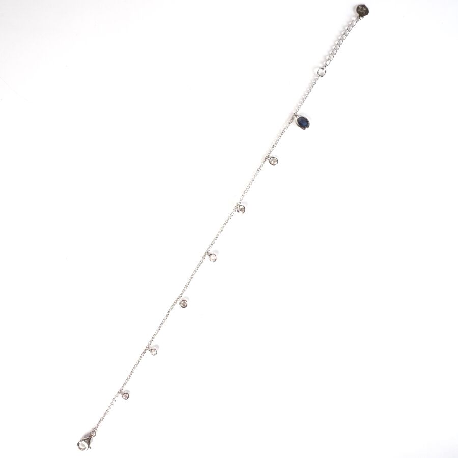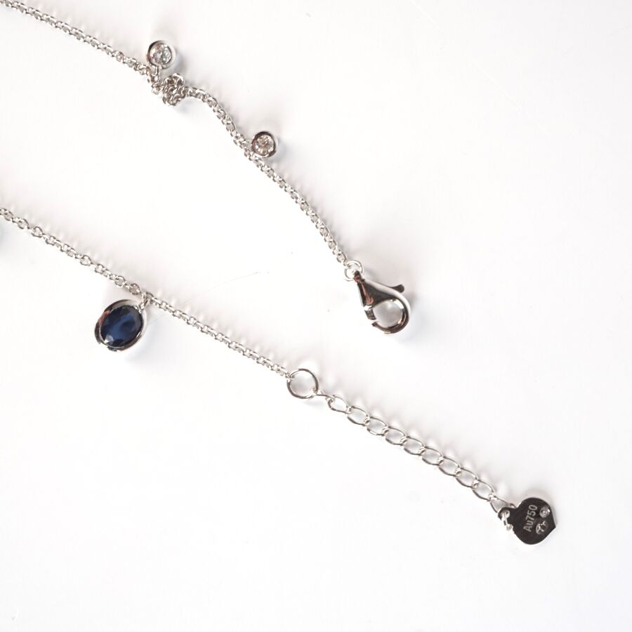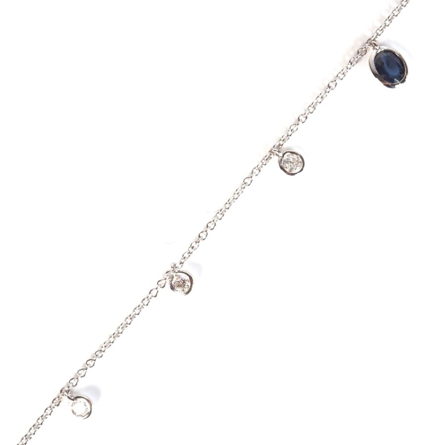 Bracelet "Pampilles" en or gris 18K (750/oo), chaîne maille forçat sertie de 6 diamants mobiles, taille moderne, calibrant au total 0.30 ct environ et d'un saphir de couleur bleu et de taille ovale calibrant 0.30 ct environ, en sertis clos, intercalés tous les 2 cm, fermoir mousquetton, L. 16.5 à 19 cm. Poids brut : 1.8 g environ.