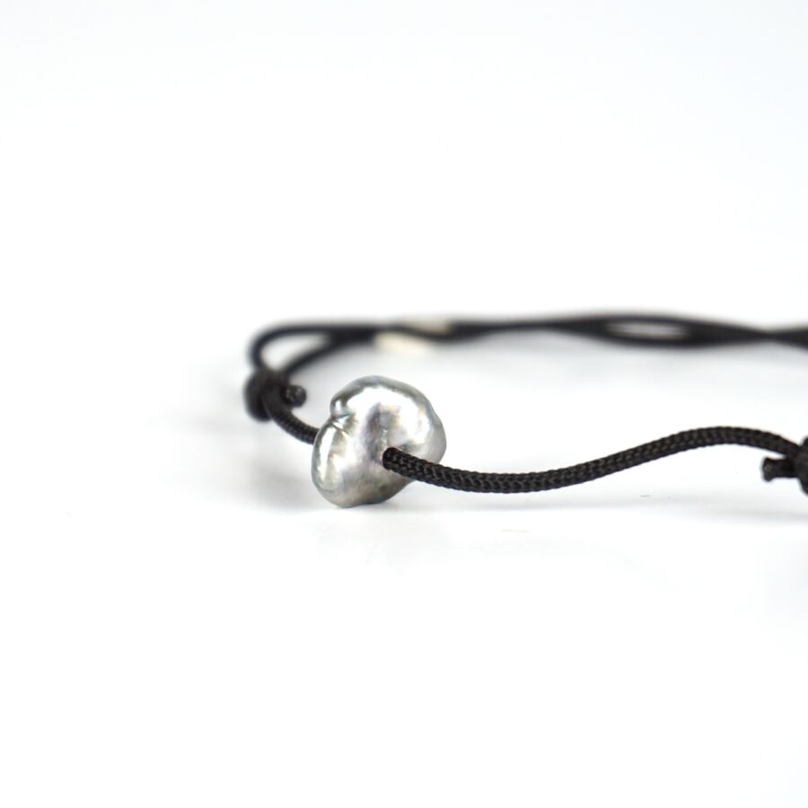 Bracelet "Perle" formé d'un cordon noir agrémenté d'un Keshi, L. Réglable. Poids brut : 0.7 g environ.