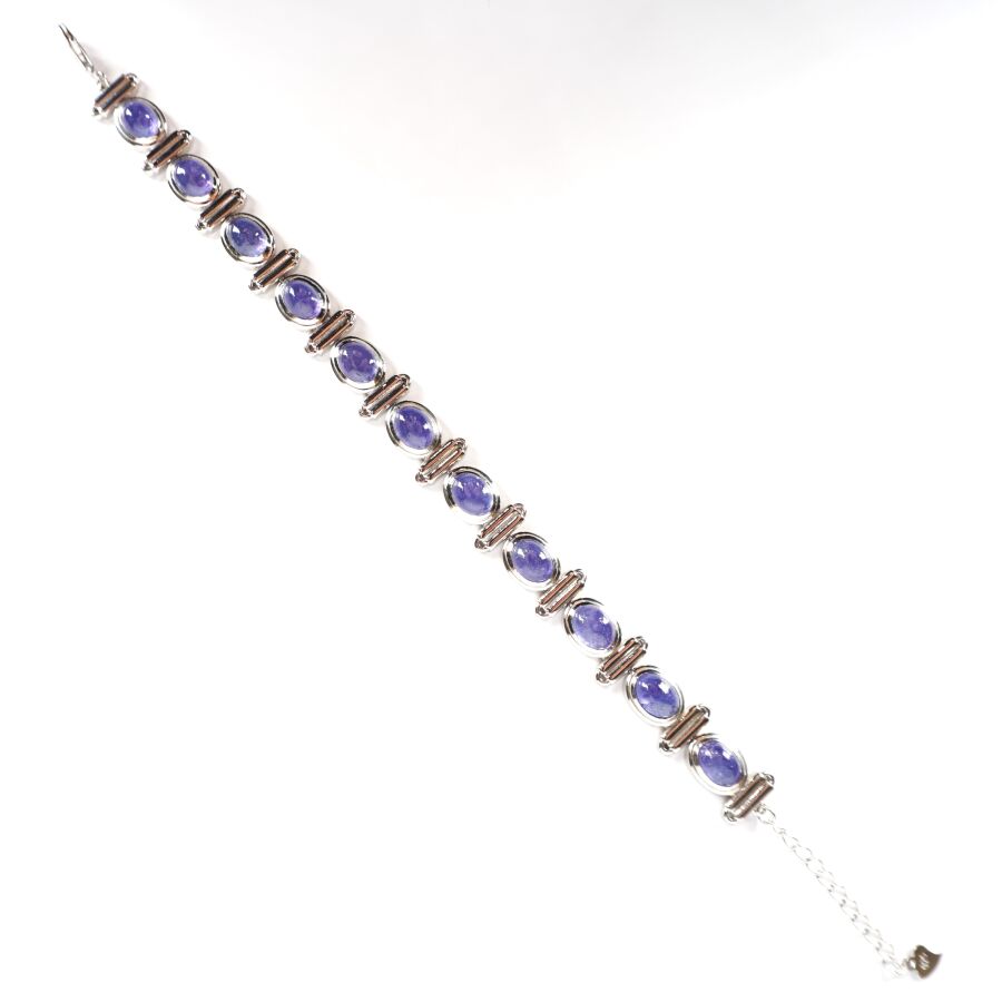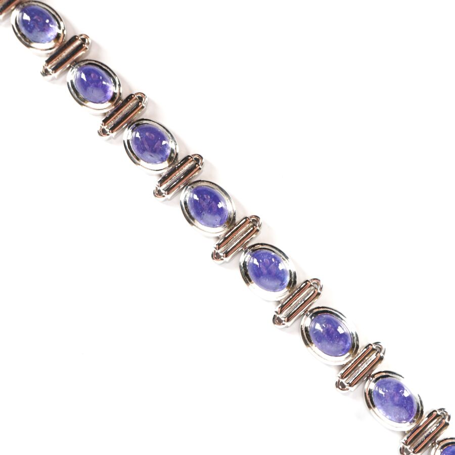 Bracelet "Rivière" en argent (925/oo) serti clos de 11 tanzanites de forme ovale et de taille cabochon (8 x 6 mm), fermoir mousqueton, L. Totale : 21.5 à 18.2 cm. Larg. 1.1 cm. Poids brut : 19.7 g environ.