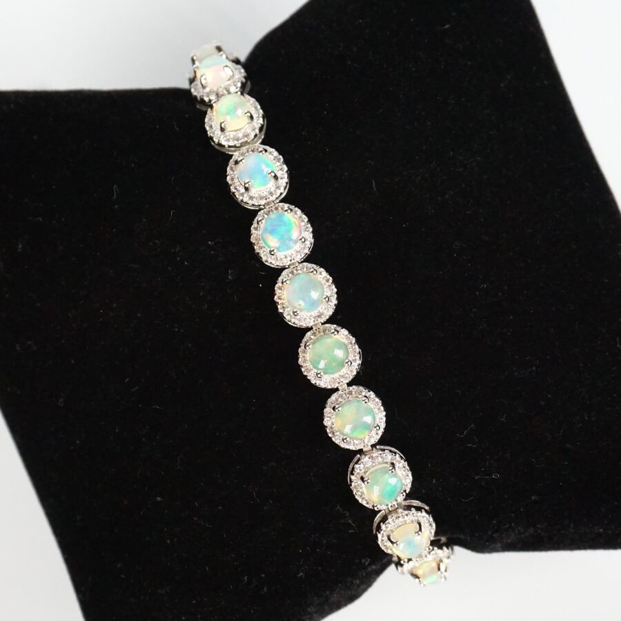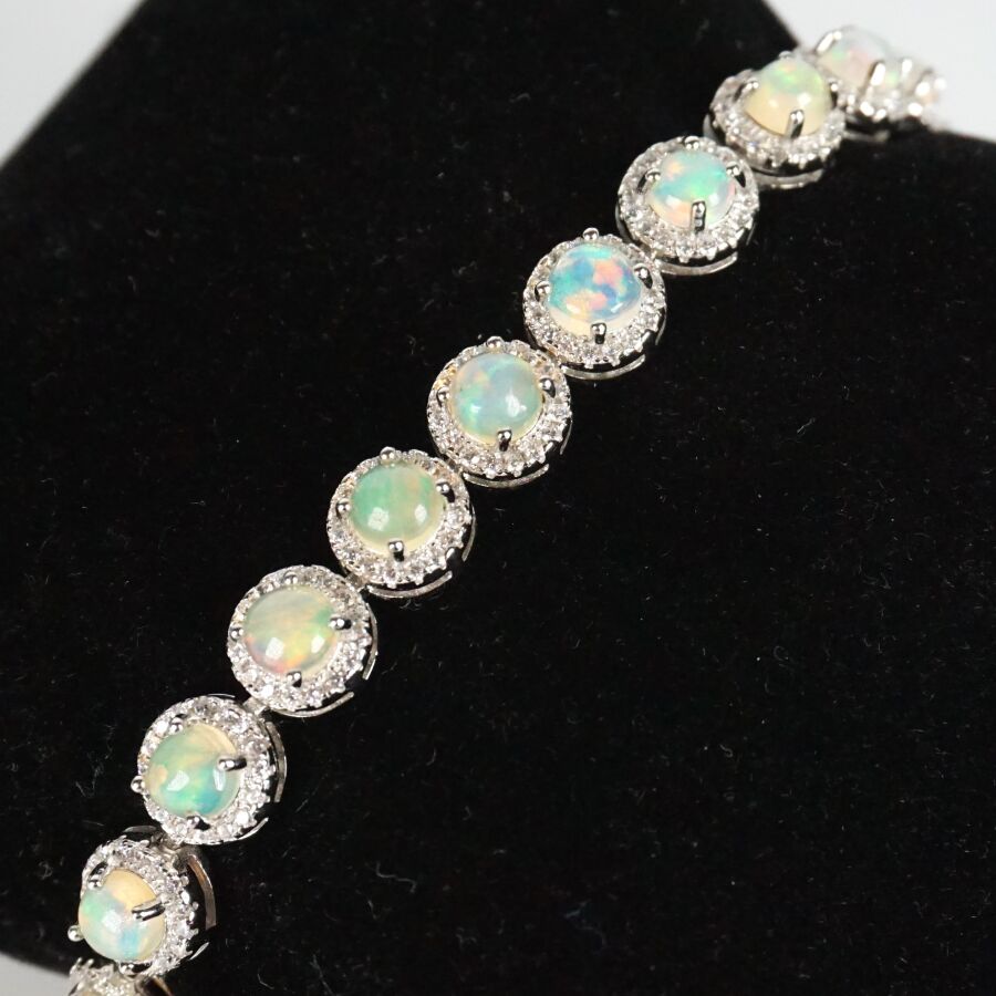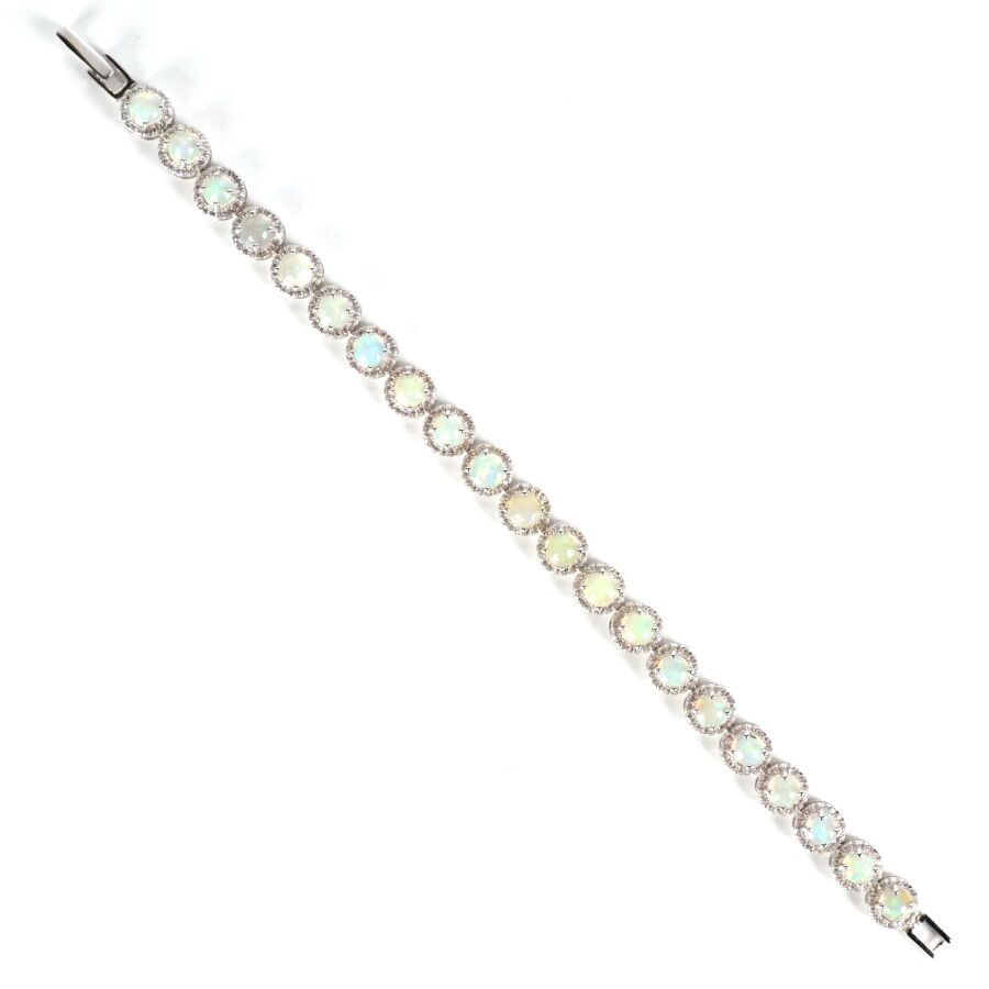 Bracelet "Rivière" en argent (925/oo), serti de 20 cabochons d'opales (D. 5 mm), encadrée chacune de 12 petits diamants taille brillant, fermoir à cliquet, L. Totale : 19 cm. L. Tour de poignet : 18.2 cm. Larg. 8 mm. H. 6 mm. Poids brut : 14.6 g environ.