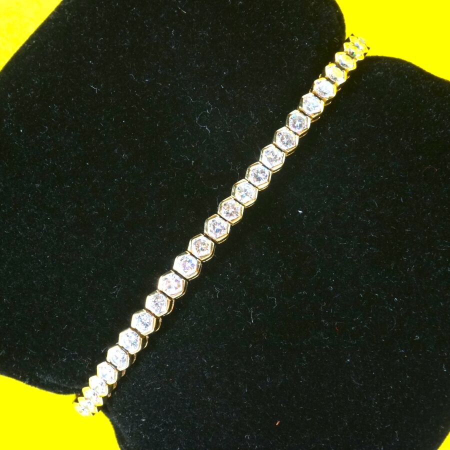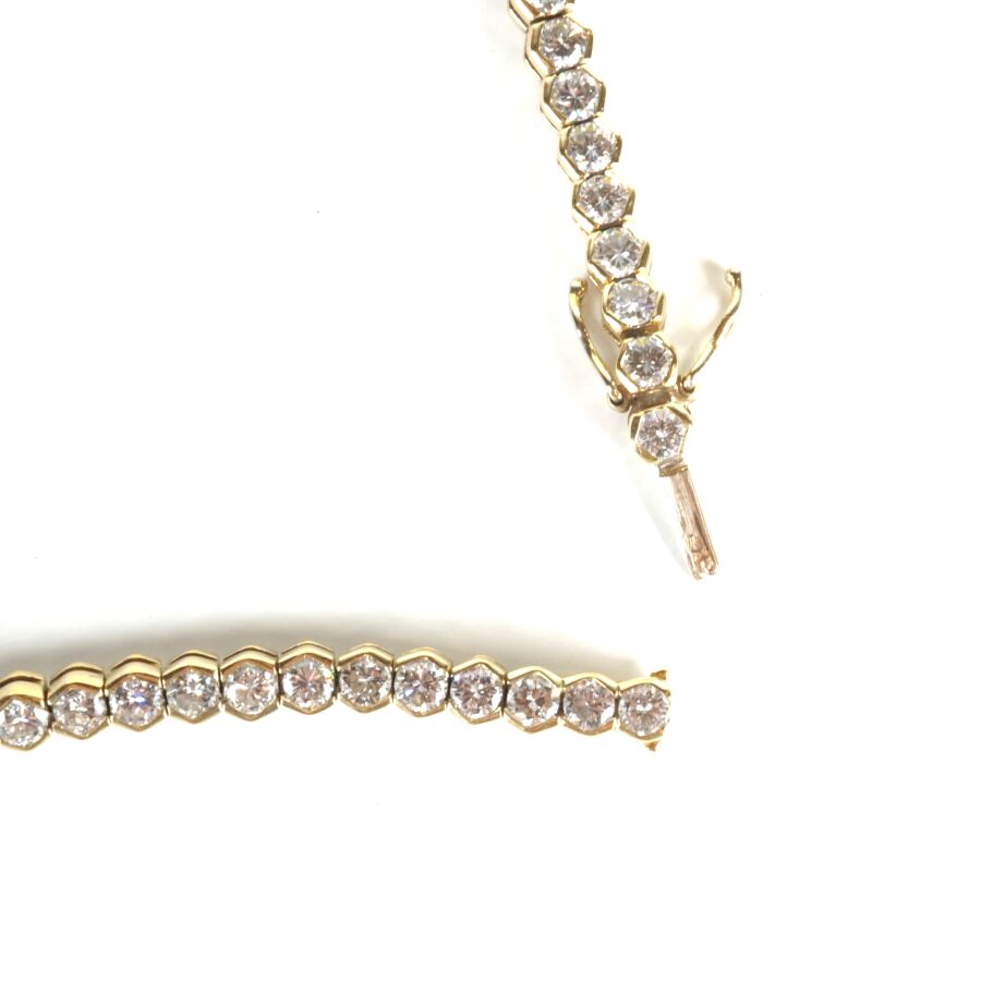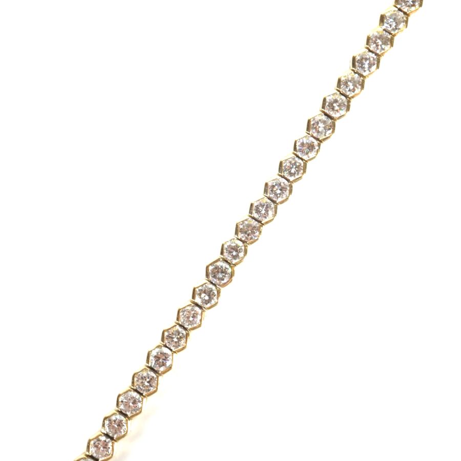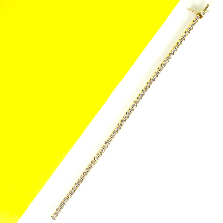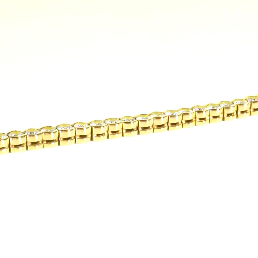 Bracelet "Rivière" en or jaune 18K (750/oo) sertie semi clos de 56 diamants taille brillant calibrant au total 2.8/2.9 cts environ (D. 2.8 mm), fermoir à cliquet avec double 8 de sécurité, L. Totale : 18 cm. L. Poignet : 17.5 cm. H. 3 mm. Poids brut : 13.7 g environ (AC).