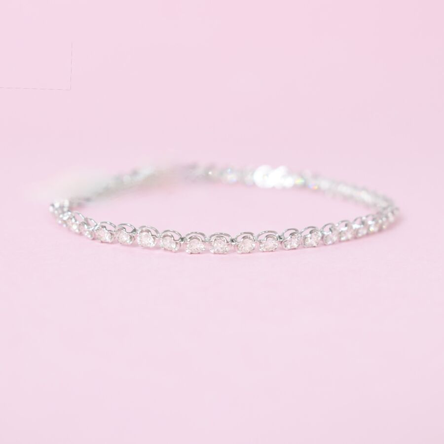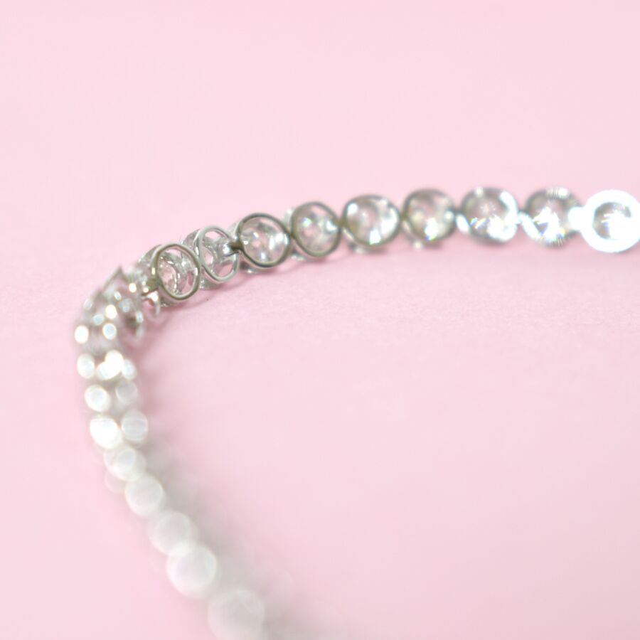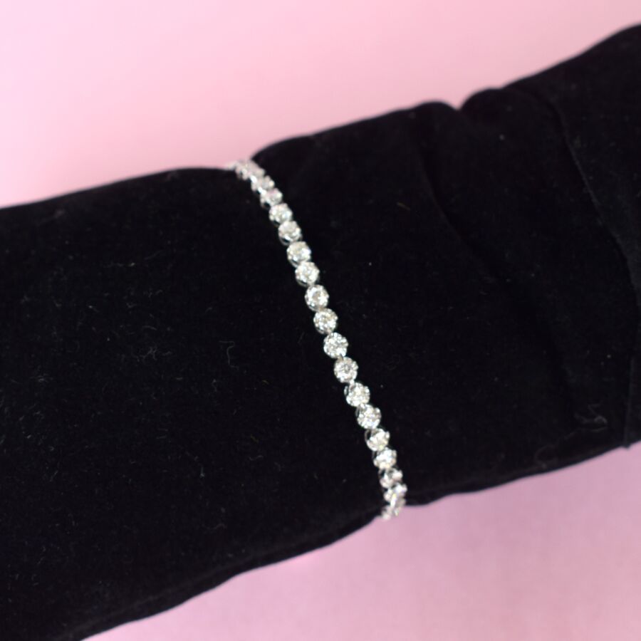 Bracelet "Rivière" en platine fin (900/oo), serti en monture panier de quarante-sept diamants taille moderne pour 3 cts environ, fermoir à cliquet et double huit de sécurité. Longueur : 17.5 cm, Poids brut : 4.9 g environ.