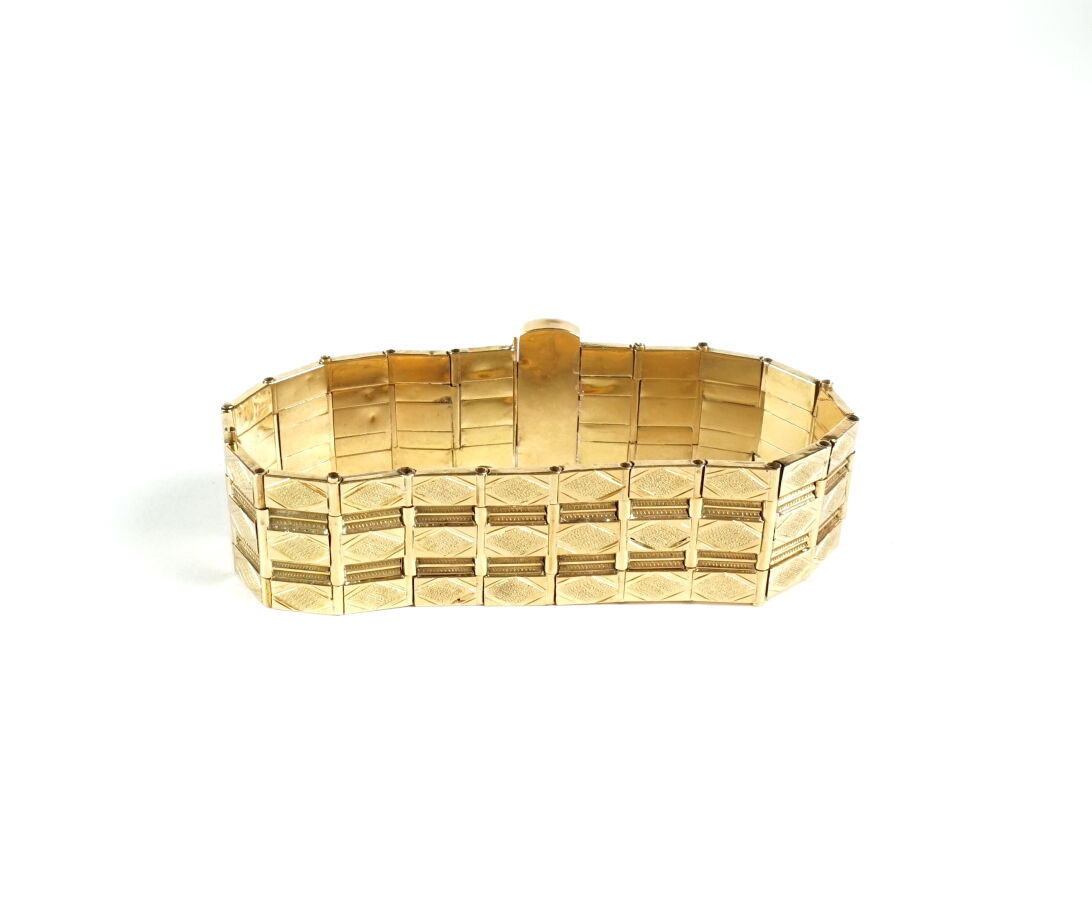 Bracelet "Ruban" en or jaune 18K (750/o), à décor ciselé de losanges, le fermoir à cliquet agrémenté de 4 cabochons rouges, probablement du corail, chaine de sécurité, L. 17.5 cm. Poids brut : 23.2 g environ.