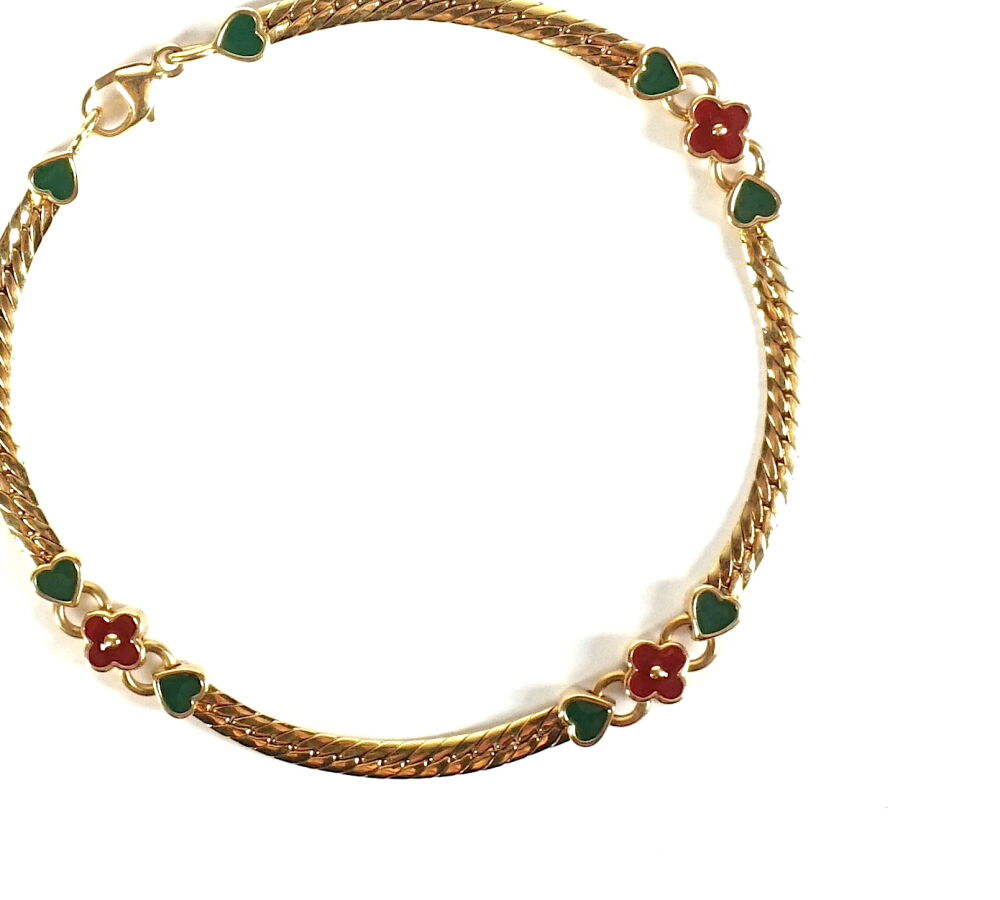 Bracelet souple en or jaune 18K (750/oo), la maille anglaise ponctuée de motifs de coeurs et fleurettes émaillés vert et rouge, fermoir mousqueton, L. 18.5 cm. Poids brut : 7.8 g environ.