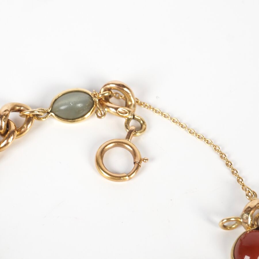 Bracelet souple en or jaune 18K (750/oo), maille gourmette agrémenté de 5 pierres de couleur taille cabochon, fermoir mousqueton, L. 19 cm. Poids brut : 9 g environ.