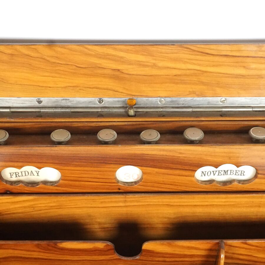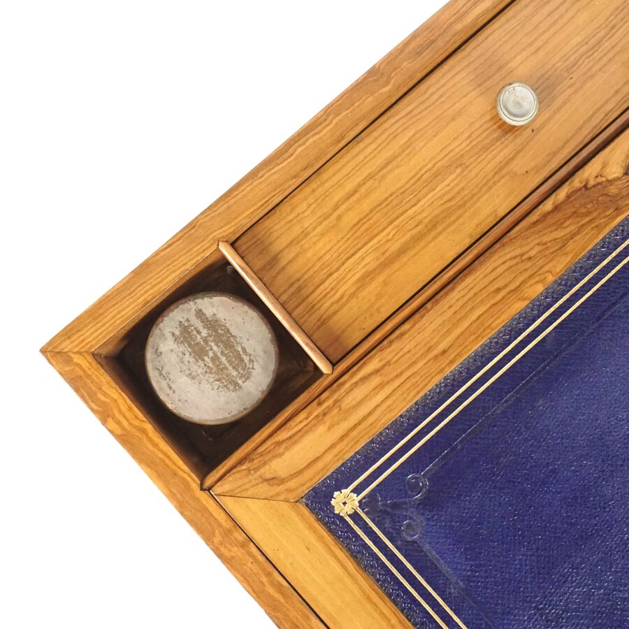 BRAMAR - LONDON : Écritoire de marine en placage de palissandre et acajou, ouvrant à deux vantaux en pente découvrant casiers à courrier et enveloppes, deux encriers (verre et métal argenté), un dateur et un tiroir pliant formant écritoire gainé de cuir bleu estampé à l'or au petit fer, serrure signée, Dim. Fermé : 29 × 40 × 40 cm (avec sa clé, petits accidents, quelques traces et usures).