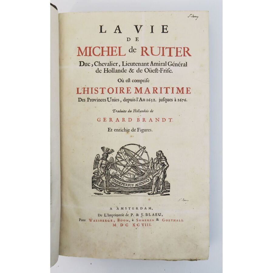 BRANDT (Gerard). Vie de Michel de Ruiter, Duc, Chevalier, Lieutenant Amiral Général de Hollande & de Oüest-Frise. Où est comprise l'Histoire maritime des Provinces Unies, depuis l'An 1652 jusques à 1676. Traduite du Hollandois. Amsterdam, Blaeu, 1698. In-folio, veau granité, dos à nerfs orné, roulette dorée sur les coupes (reliure de l'époque).