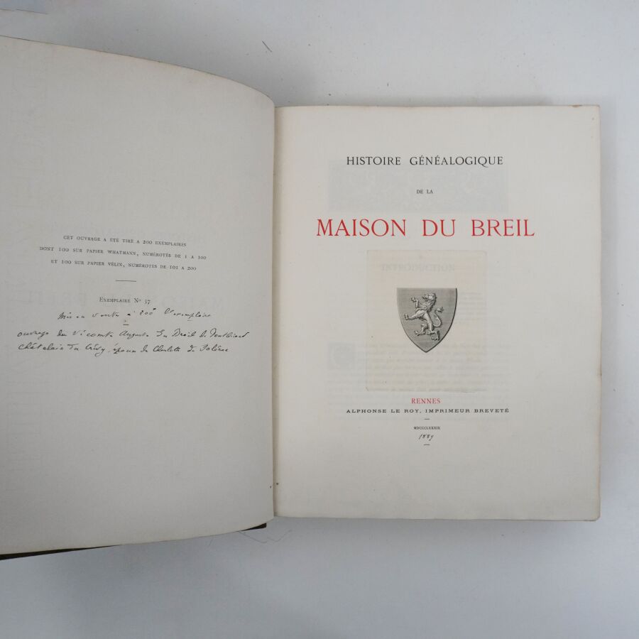 [BREIL (Auguste du)]. Histoire généalogique de la maison du Breil. Rennes, Alphonse Le Roy, 1889. In-4 demi-chagrin marron à coins, dos à nerfs, titre doré, tête dorée, couv. conservées (reliure de l'époque). Tableau généalogique dépliant.