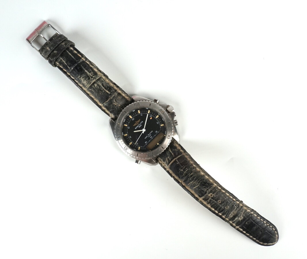 BREITLING : Montre d'aviateur "New Pluton 3100", boîtier rond en acier, 40 mm, cadran noir mat, index et aiguilles luminescentes, affichage par écran et cristaux liquide à 6h lunette tournante, fond numéroté A51037 43558 bracelet cuir noir façon croco, boucle ardillon en métal siglée (usures générales, quelques rayures au verre, bracelet usagé).