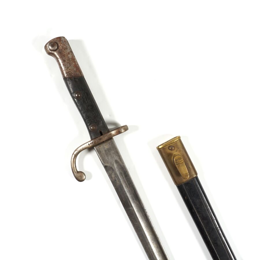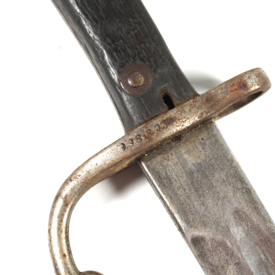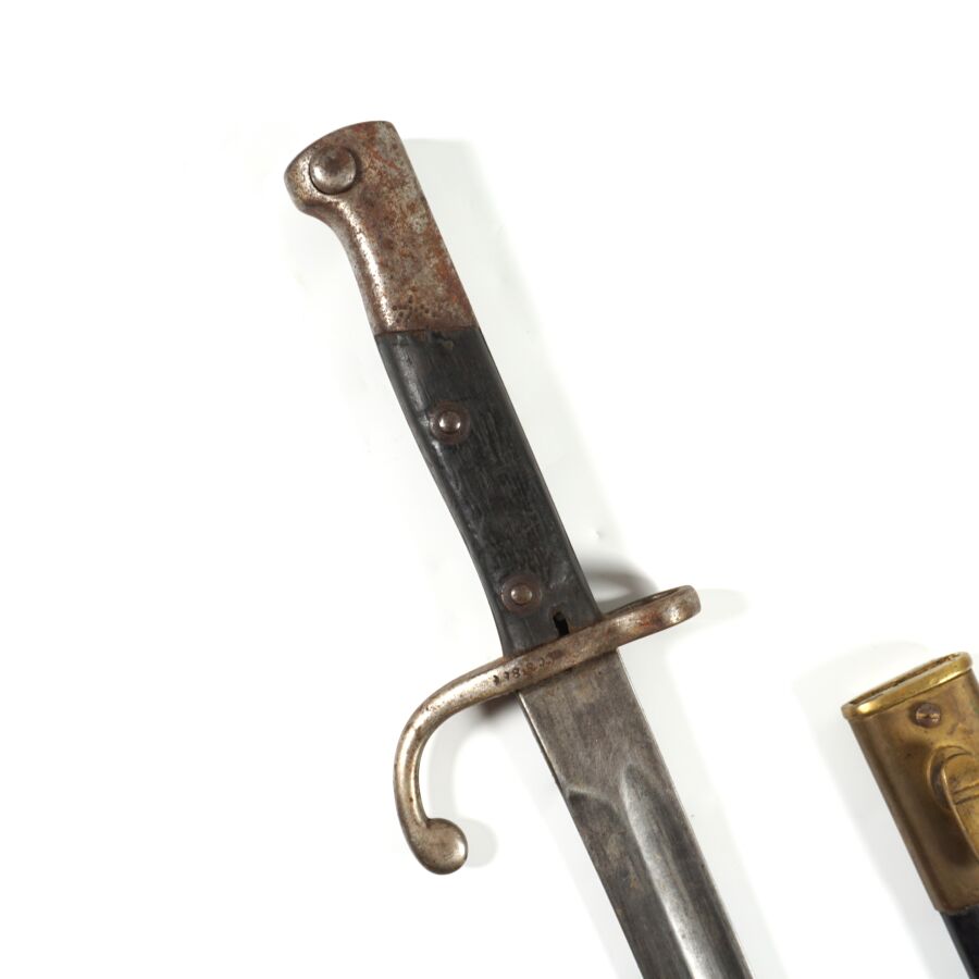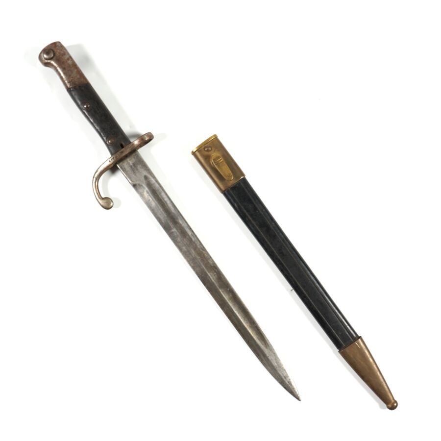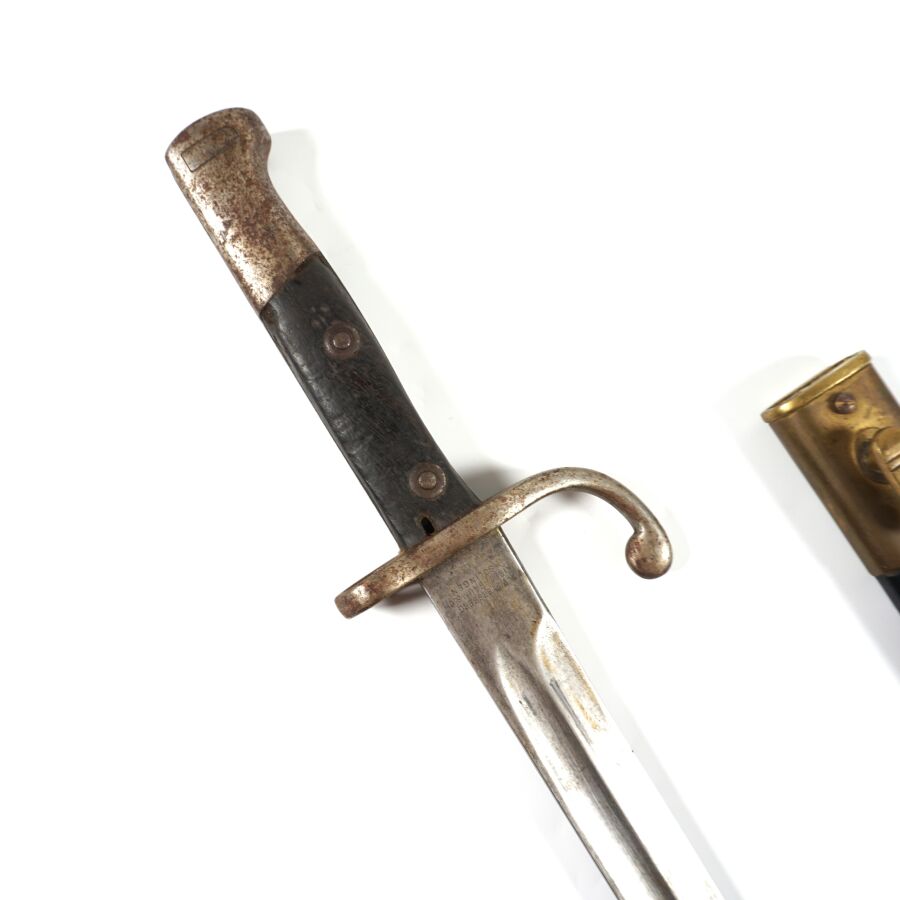 BRESIL - BAIONNETTE MAUSER MODELE 95, pommeau et croisière en acier à quillon arrondi matriculée " CC8866 ", plaquette de la poignée en bois noirci, lame à pans creux marquée au talon " WEYERSBERG KIRSCHBAUM & C SOLINGEN ", fourreau en cuir noir à garnitures en laiton, ABE.