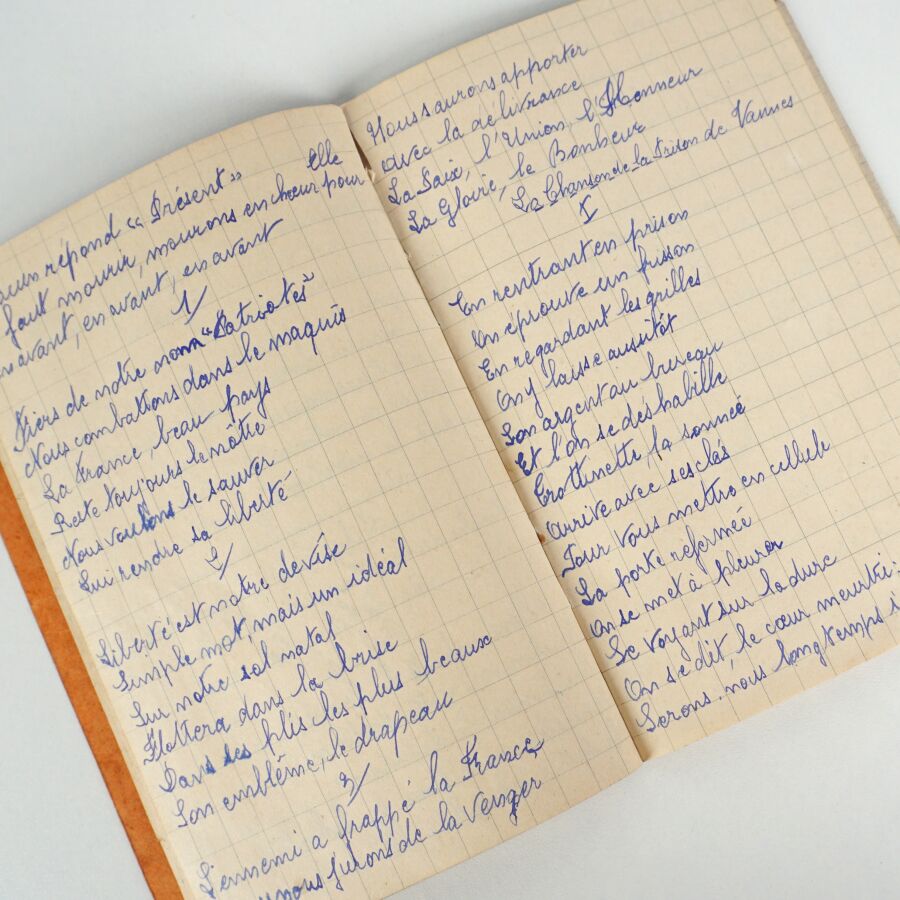 Recueil de chants patriotiques et résistants de la Seconde Guerre mondiale (Chanson du maquis, Le Patriote, Trois gars de France, Les Anglais débarqueront, Chanson sur l'invasion, l'occupation et la libération de la France, Jeunesse debout, Liberté : marche des Forces Françaises de l'Intérieur et de la Libération, L'Armée du maquis…). Premiers ff. plus courts sans manque de texte.