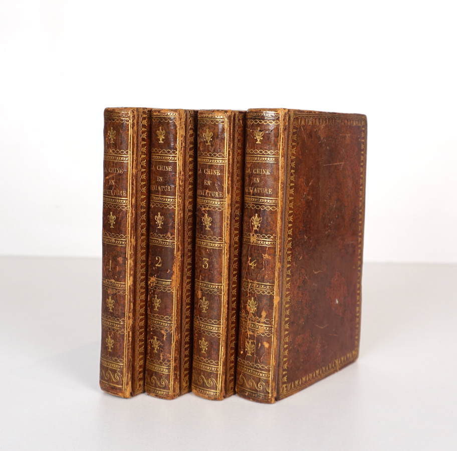 [BRETON DE LA MARTINIÈRE (Jean-Baptiste)] - La Chine en miniature, ou choix de costumes, arts et métiers de cet empire - Paris ; Nepveu, 1811 - 4 volumes In-18° - 4 frontispices (celui du tome III relié au tome II), et 76 figures hors texte en coloris d'époque représentant des scènes pittoresques et des costumes chinois - Reliure de l'époque veau havane marbré glacé (légers frottements aux plats et aux mors, 1 coin usé) - Plats encadrés d'1 roulette dorée - Roulette intérieure - Dos lisse ornés de filets et de lyres dorés, titrés et tomés or - Tranches dorées.
