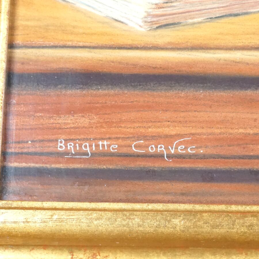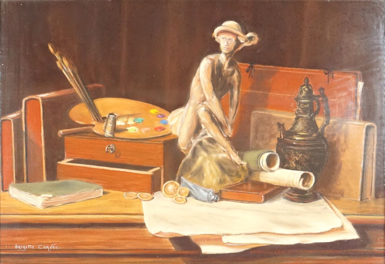 Brigitte KORVEC (XXe), "Nature morte à la palette du peintre", pastel sur papier signé en bas à gauche, 38 x 55 cm (à vue).
