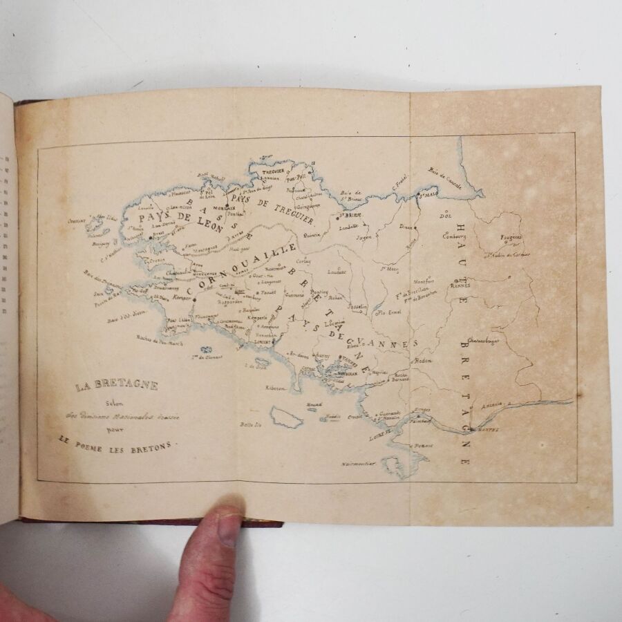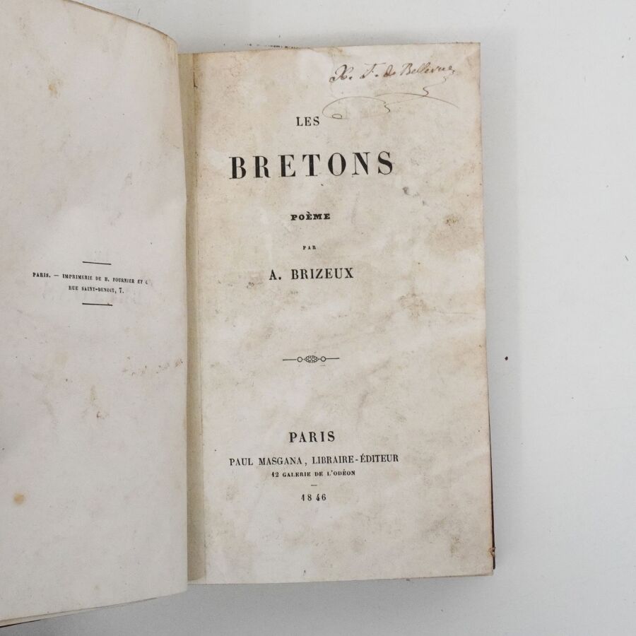 BRIZEUX (Auguste). Les Bretons. Poème. Paris, Paul Masgana, 1846. In-12 demi-chagrin rouge à coins, dos à nerfs, titre doré (reliure de l'époque). Rousseurs, page titre doublée et remontée. Carte dépliante (brunie) in fine. Édition originale. (Vicaire I, 931.) Ex-libris héraldique (de sable au chevron d'argent à la devise "Ne Furori") de la famille Fournier de Bellevue (Berry, Saint-Domingue, Bretagne). Ex-libris manuscrit du comte Xavier-F. de Bellevüe.