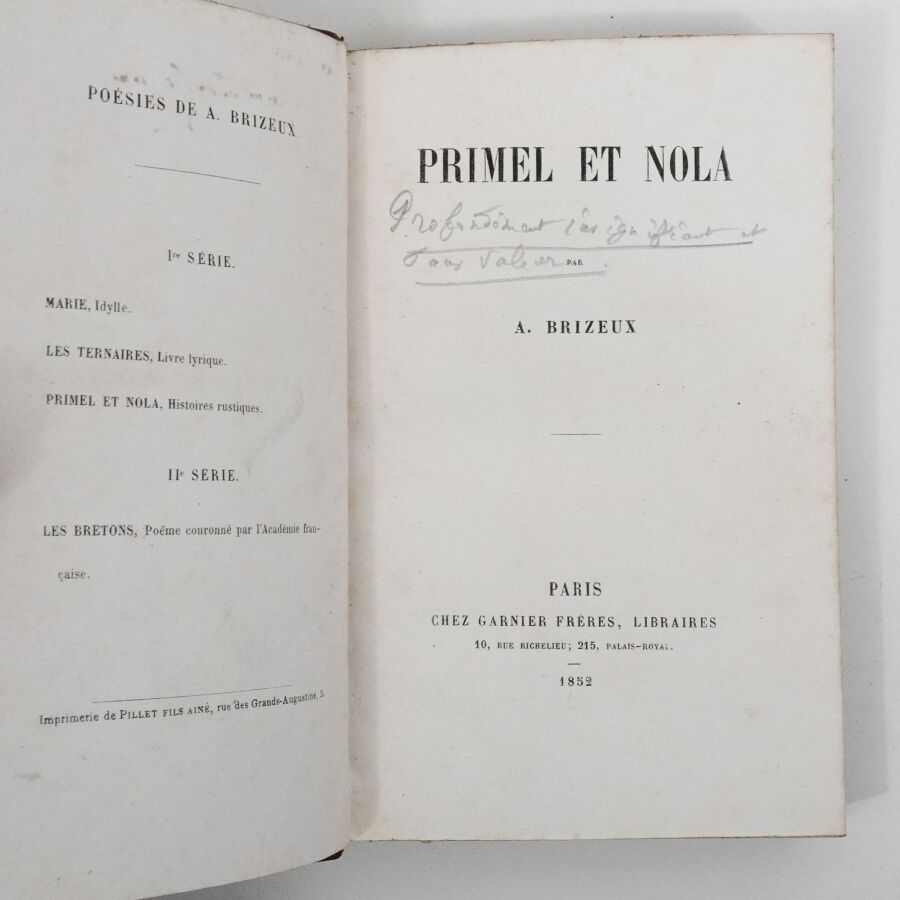 On y joint, du même auteur, en reliure identique : Primel et Nola. Paris, Garnier frères, 1852. Édition originale. (Vicaire I, 932.) Ex-libris manuscrit du comte Xavier-F. de Bellevüe (qui l'a lui-même probablement gratifié d'une sévère critique au titre à la mine de plomb "profondément insignifiant et sans valeur"…).