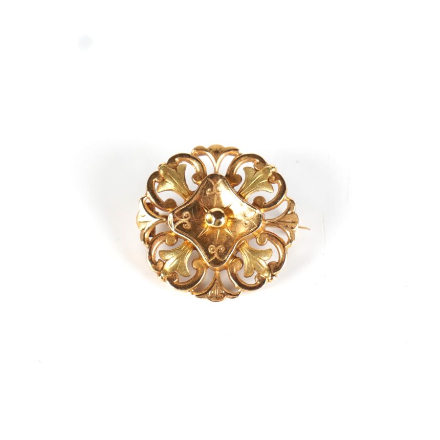 Broche ajourée en or jaune 18K (750/oo) à décor d'une rosace stylisée, Diam. 2.3 cm. Poids brut : 1.5 g environ.