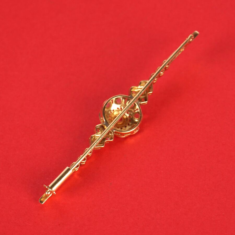 Broche baguette en or jaune 18K (750/oo), sertie de verroteries blanches à l'imitation du diamant, L. 6.5 cm. Poids brut : 3.6 g environ.