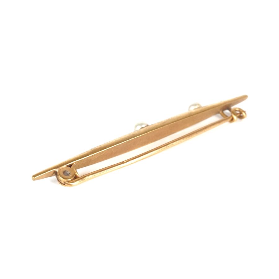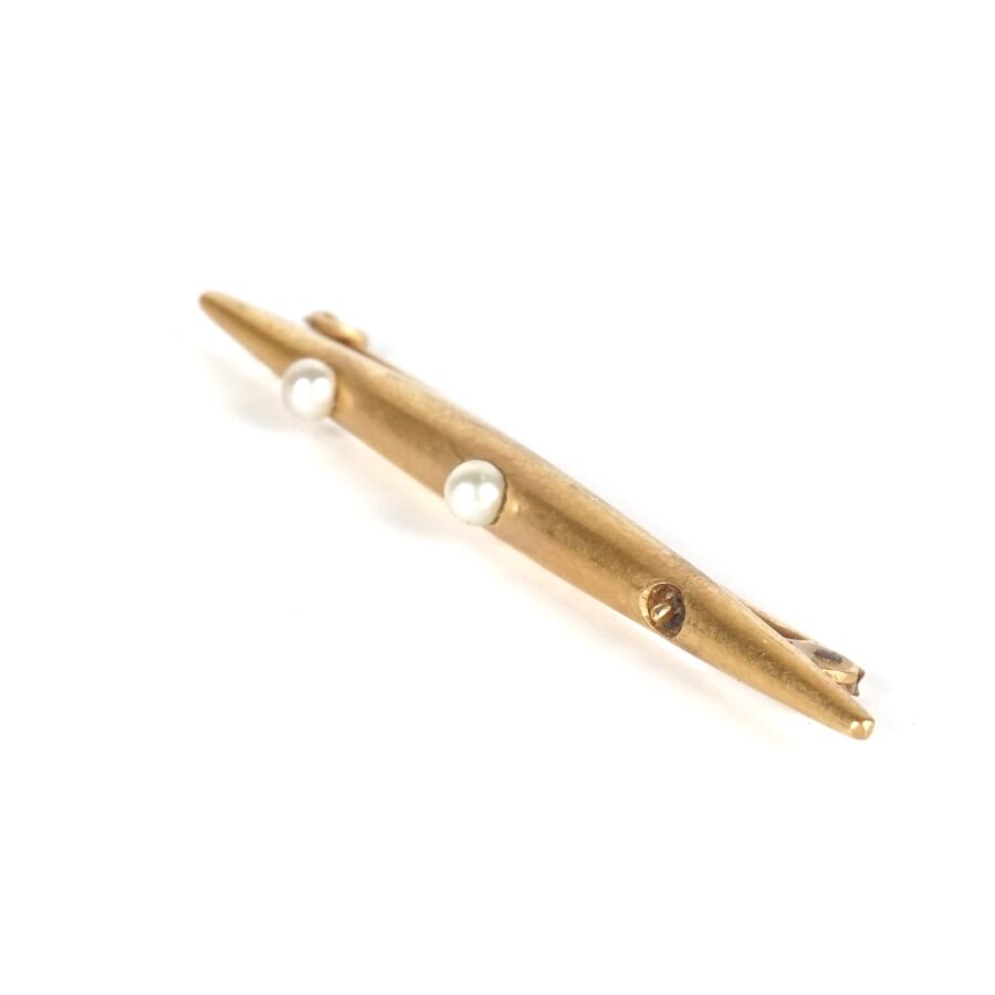 Broche barette en or jaune 18K (750/oo), sertie de deux semi de perles blanches, L. 4.8 cm. Poids brut : 2.4 g environ (manque une perle).