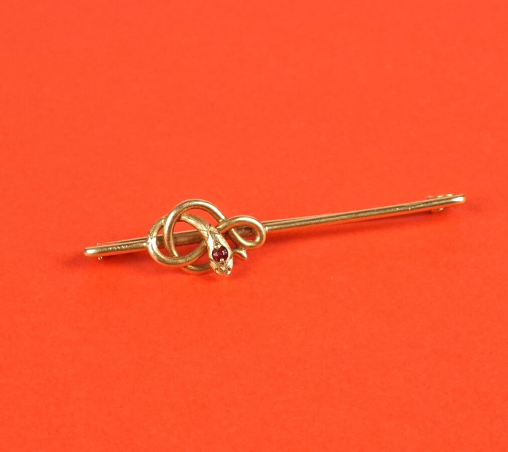 Broche "Barrette" en or jaune 18K (750/oo), poinçon tête de cheval (1838-1919), agrémentée d'un serpent enroulé et serti d'une pierre rouge, probablement un rubis, L. 5 cm. Poids brut : 2.9 g environ.