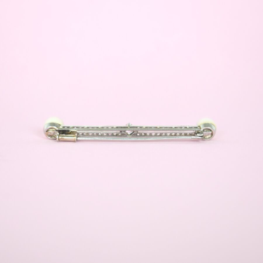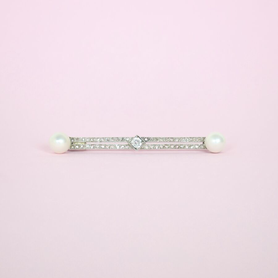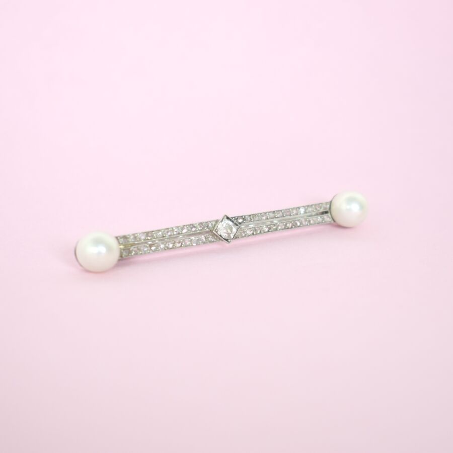 Broche barrette en platine (850/oo) centrée d'un diamant calibrant environ 0,2 ct environ pavée de 48 diamants tailles ancienne pour un total d'environ 0.9 ct, rehaussée à ses extrémités de deux perles blanches probablement de culture, fermoir à épingle, circa 1930, L. 5.7 cm. Poids brut : 6.4 g environ.