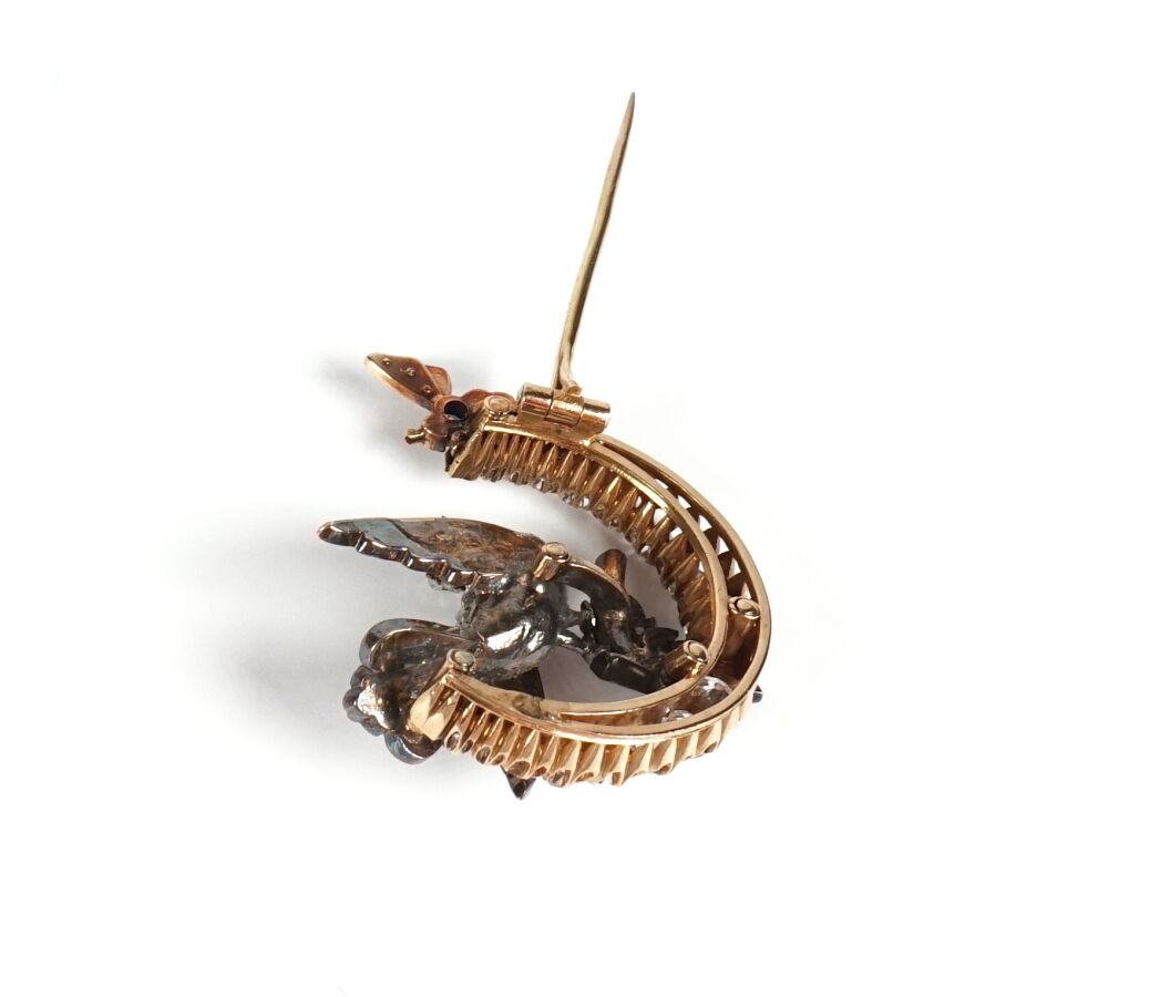 Broche "Colombe" en or de 2 tons 18K (750/oo), formée d'un croissant serti de diamants taille ancienne, les pierres les plus importantes calibrant 0.15 carat environ, accueillant l'oiseau branché et un papillon entièrement sertis de diamants taille rose, d'une pierre bleue et d'une pierre rouge, probablement saphir et rubis, L. 3.5 cm environ (manque le fermoir). Poids brut : 14.1 g environ.