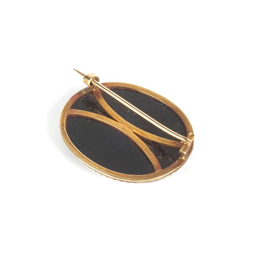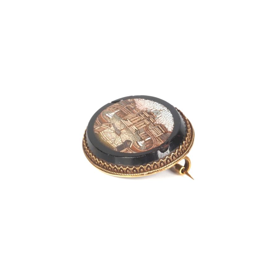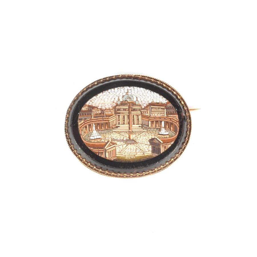 Broche de forme ovale, monture en or jaune 18K (750/oo), sertie d'une micro-mosaïque polychrome figurant Saint-Pierre de Rome (accidents en bordure), Dim. 4.2 x 3.5 cm. Poids brut : 19.4 g environ.