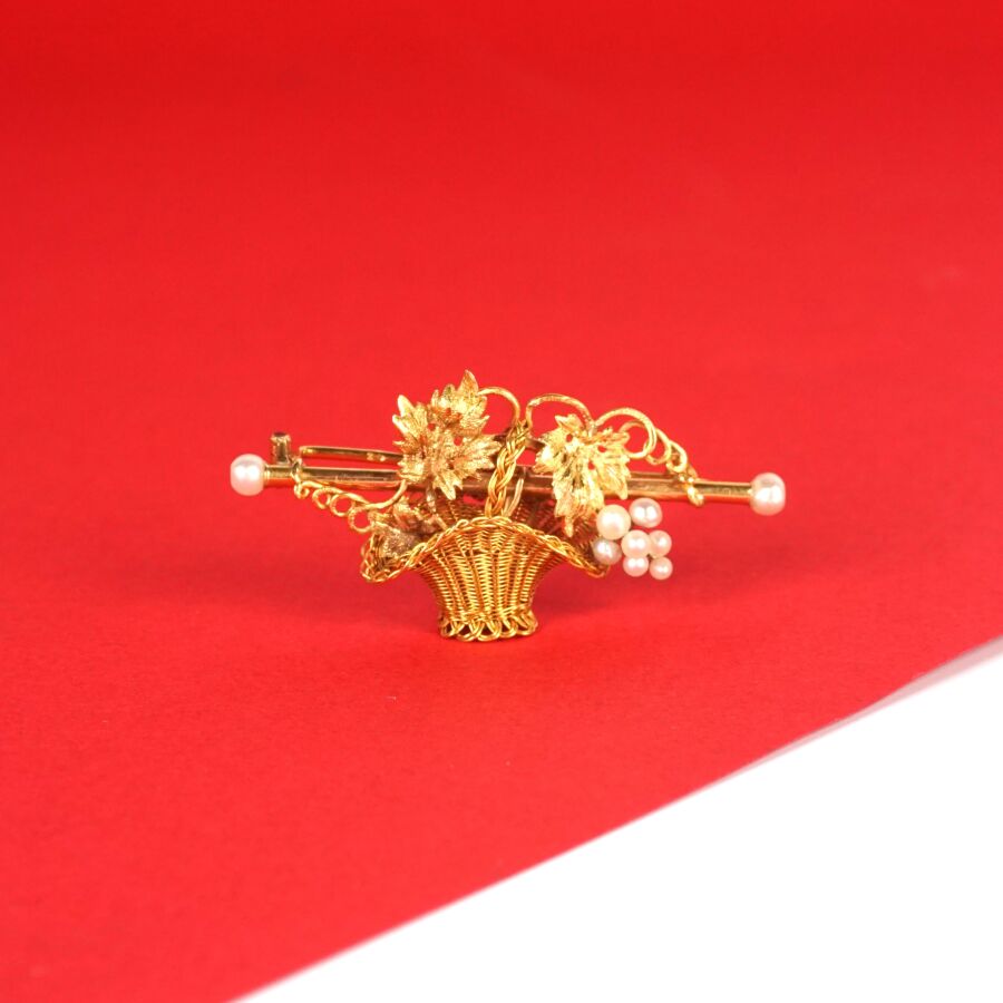 Broche en or jaune 18K (750/oo) à motif d'un panier et de ceps de vigne partiellement amati, la tige agrémentée de deux perles aux extrémités (D. 0.3 mm) et 7 petites perles ornant le panier, L. 4.1 cm. Poids brut : 3.6 g environ.