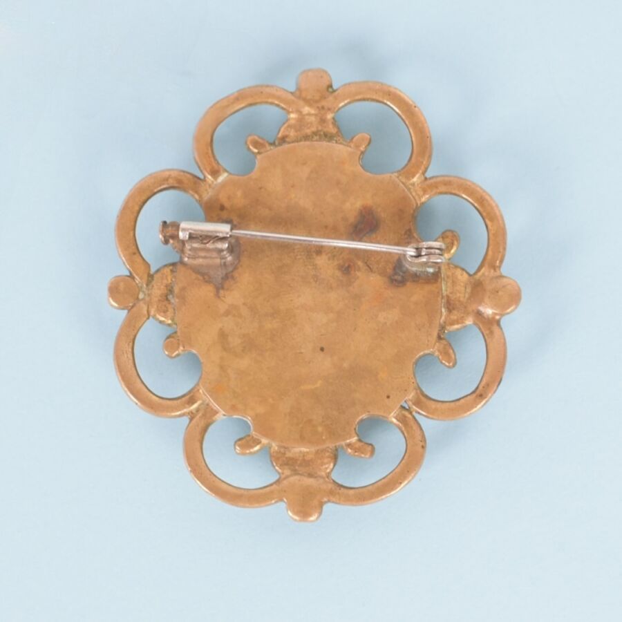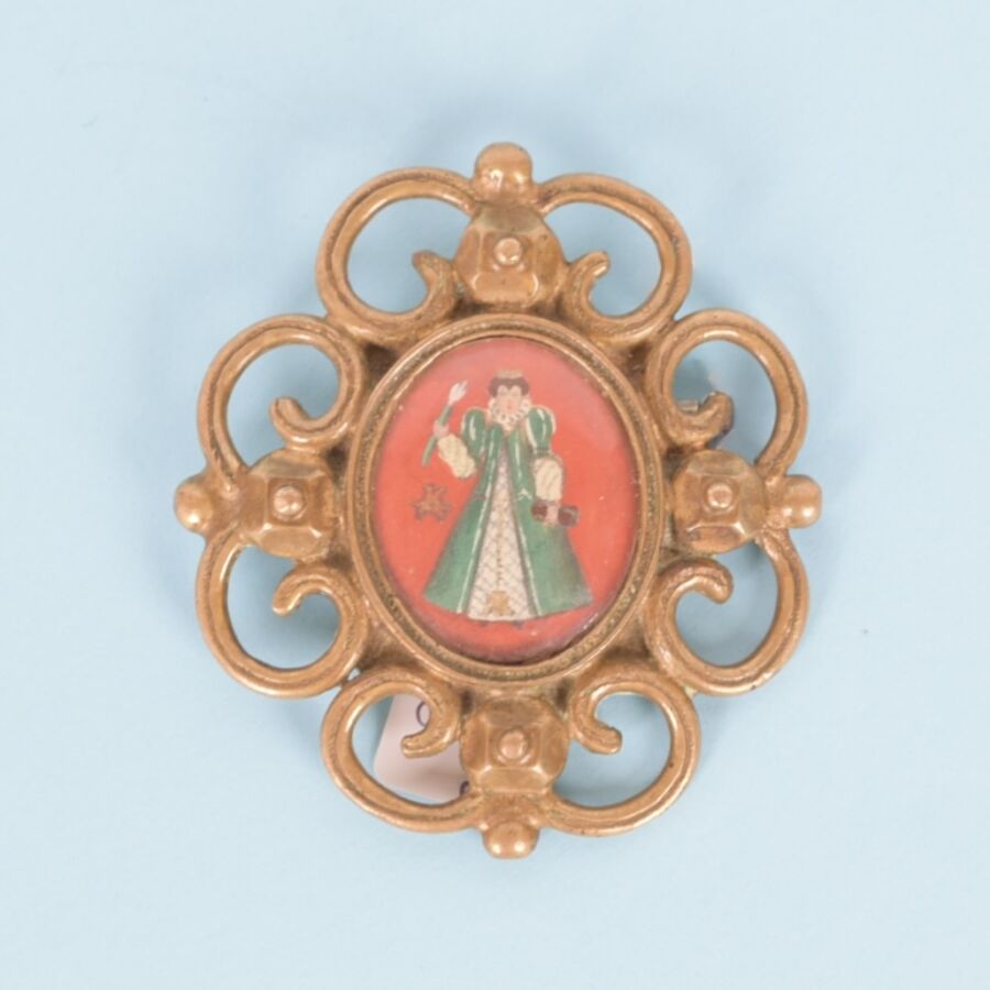 Broche fantaisie en métal doré à décor de volutes, orné d'un médaillon ovale représentant une reine médiévale sur fond rouge peinte à la gouache, Dim. 60 x 60 mm