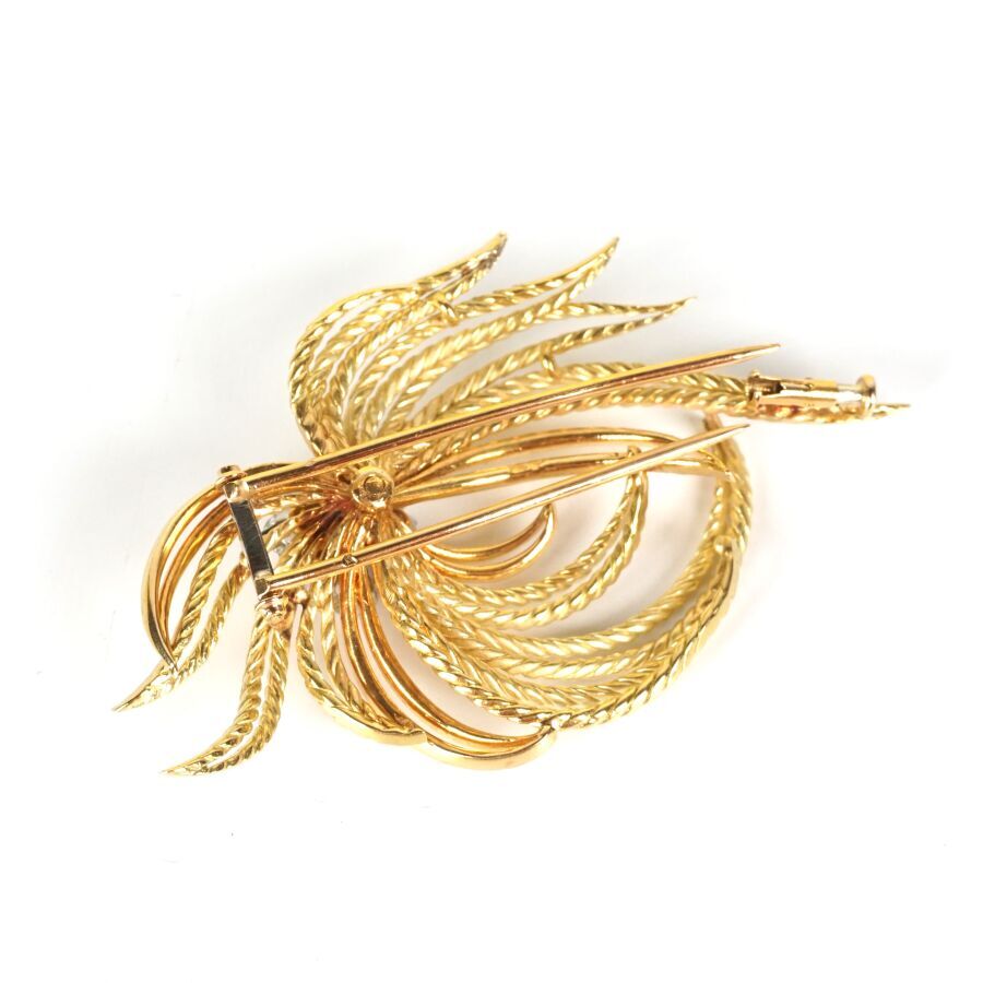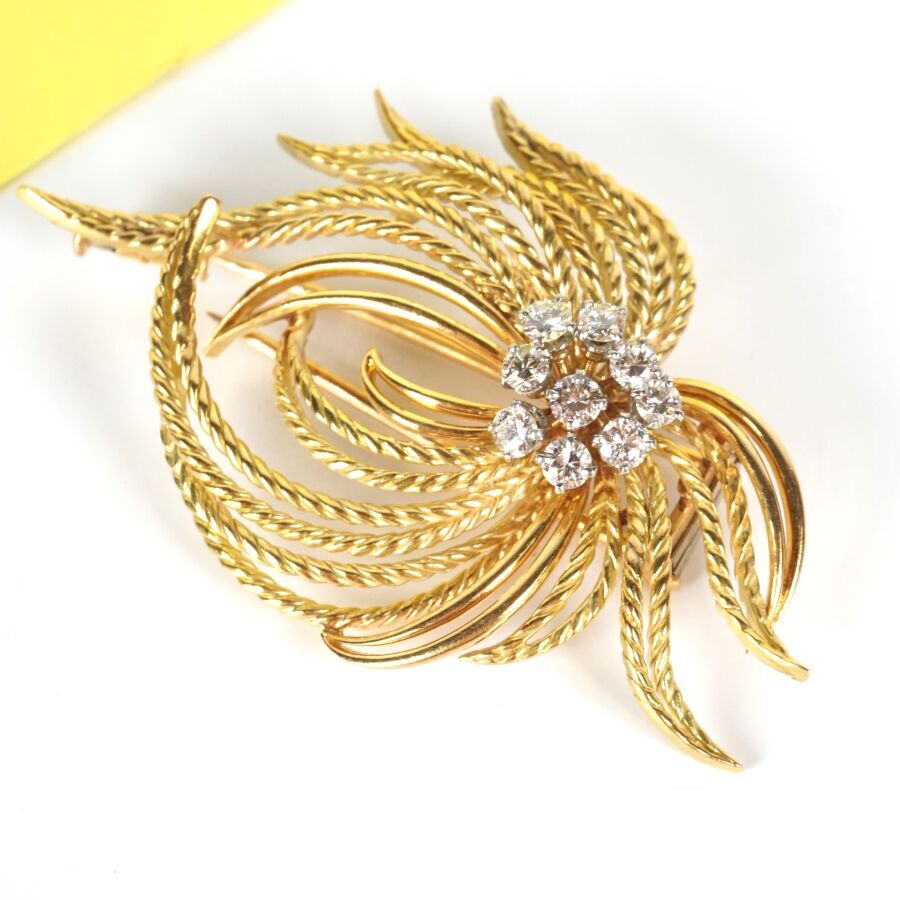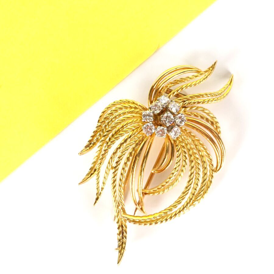 Broche "Feuillage" en or jaune 18K (750/oo), retenant en son centre une fleur sertie de 9 diamants ronds calibrant au total 0.6/0.7 ct environ, Dim. 5.6 x 3.6 cm. Poids brut : 16.5 g environ.