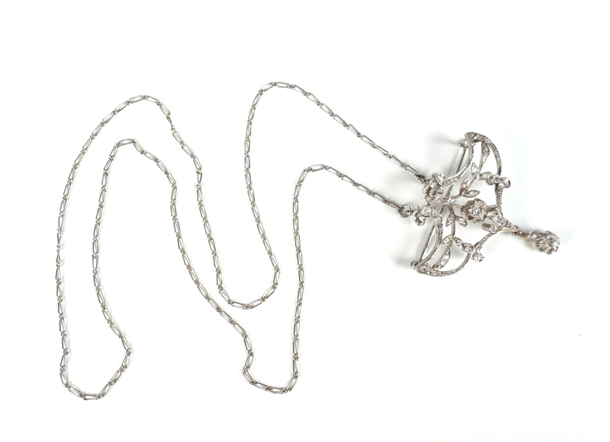Broche feuillagée ajourée pouvant former pendentif en or gris 18K (750/oo), formée de rinceaux, branches et fleurette, l'ensemble serti de diamants taille rose, le centre et une pendeloque sertis d'un diamant taille ancienne calibrant environ 0.15 carat chaque, travail de la fin du 19e-début du 20e siècle, 3.5 x 3.5 cm.