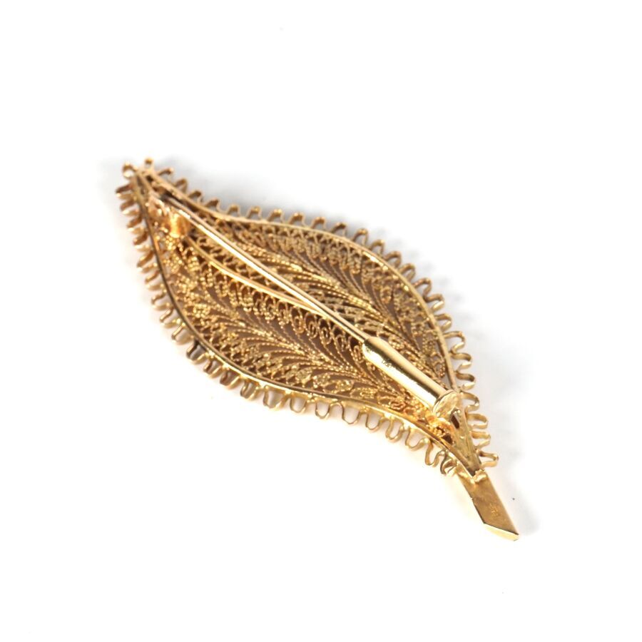 Broche "Feuille" en or jaune 18K (750/oo) ajouré et filigrané, L. 6 cm. Larg. 2.3 cm. Poids brut : 9.4 g environ.