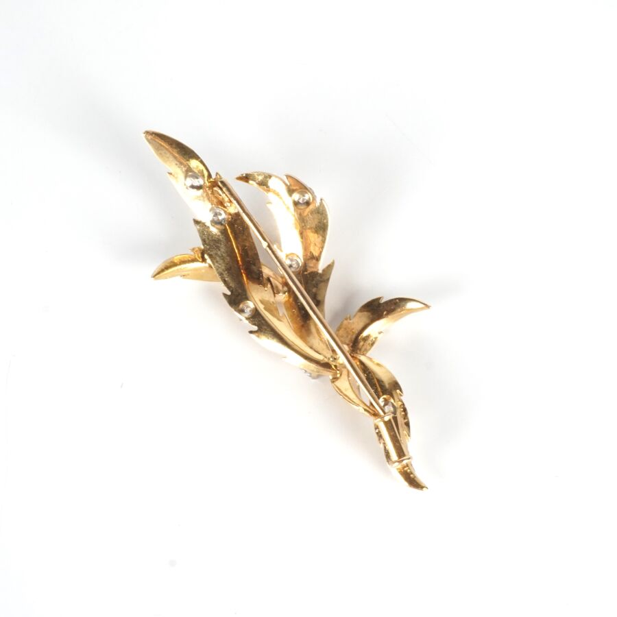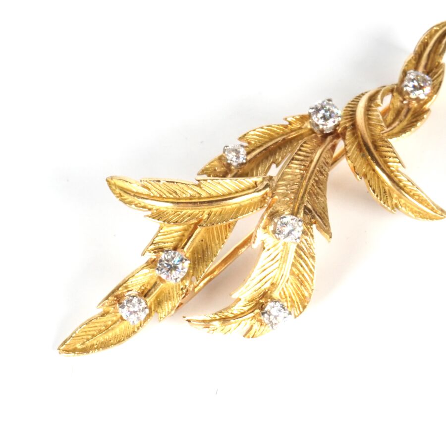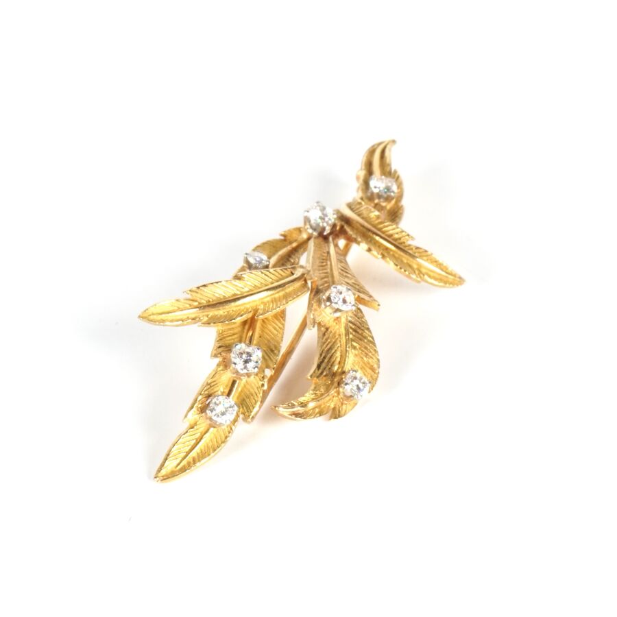 Broche "Feuille" en or jaune 18K (750/oo) sertie de 7 diamants taille brillant calibrant au total 0.5 cts environ, L. 6.1 cm. Larg. 3 cm. Poids brut : 10.3 g environ.