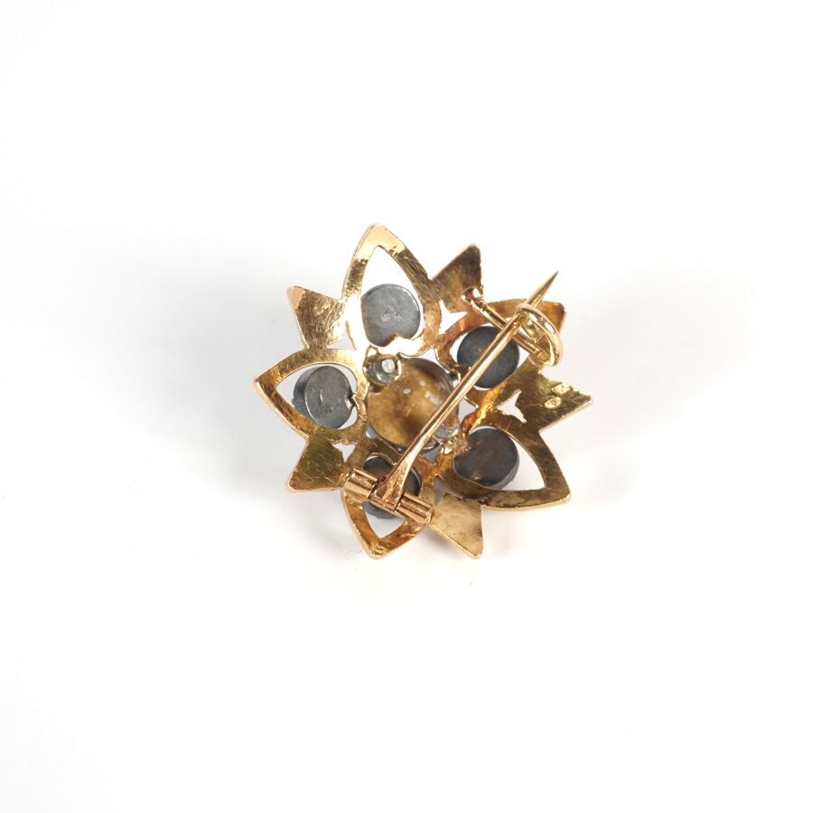 Broche "Fleur" ajourée en or jaune 18K (750/oo) et argent (800/oo), poinçon "Argor", sertie au centre de 6 diamants taille rose, D. 3 cm. Poids brut : 8.6 g environ.