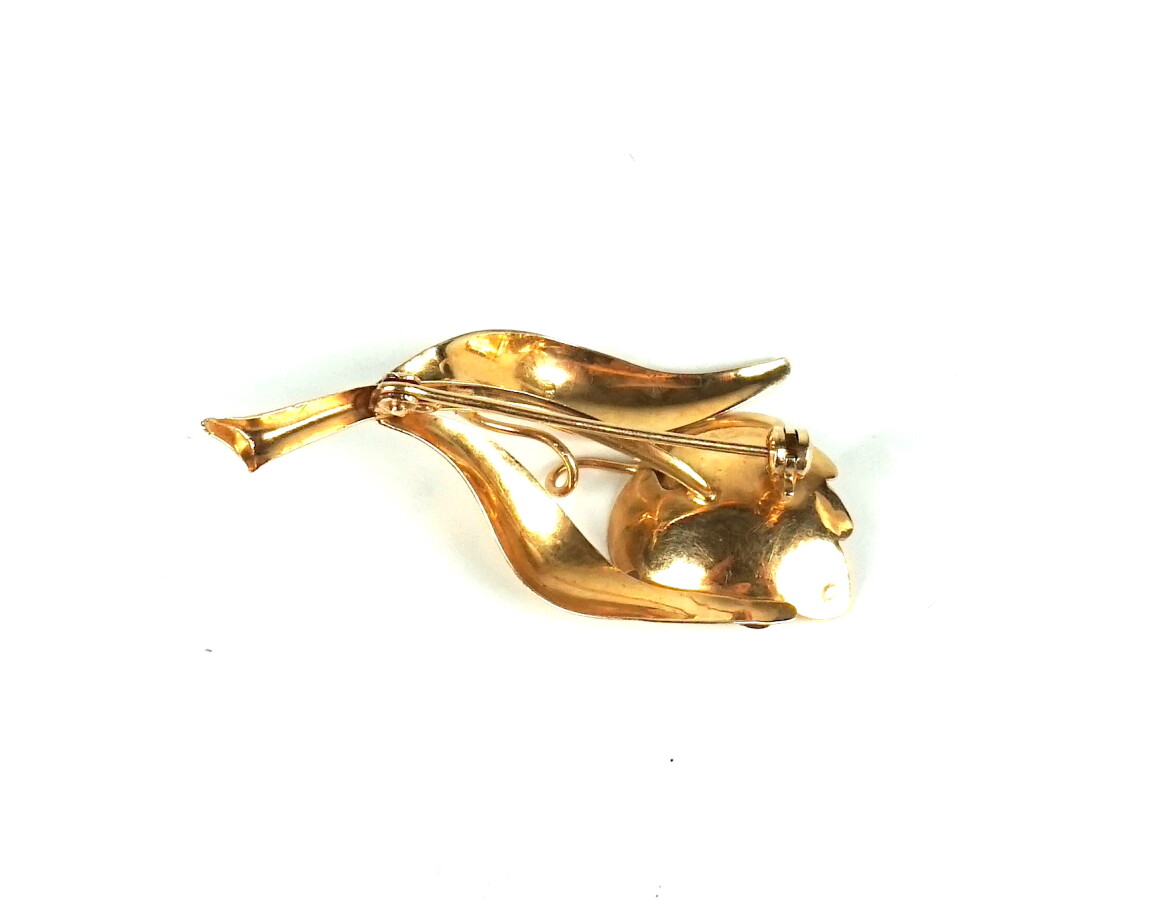Broche "Fleur" en or jaune 18K (750/oo), à décor ciselé, manque probablement une perle au coeur, H. 4.7 cm. Poids brut : 3.42 g environ.