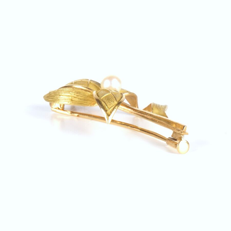 Broche "Fleur" en or jaune 18K (750/oo) finement ciselé, retenant au centre une perle (D. 6 mm), L. 4.7 cm. Larg. 2.1 cm. Poids brut : 8 g environ.