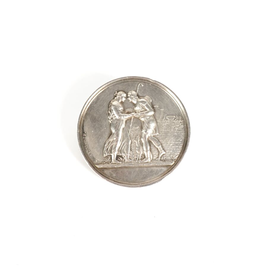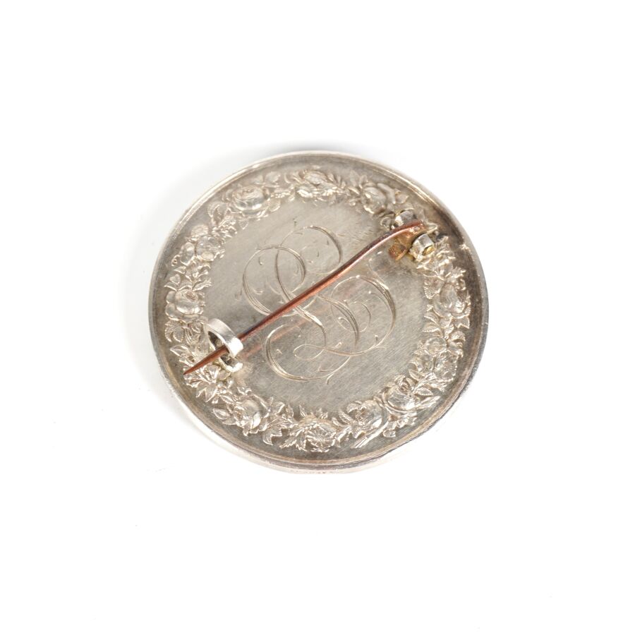 Broche "Médaille dite de mariage" en argent (925/oo) à motif sur l'avers d'un berger et sa femme accompagnés de leur chien, signée Andrieu F, et sur le revers du chiffre gravé "GL" encadré d'une guirlande de fleurs, Diam. 3.7 cm. Poids brut : 22.8 g environ.