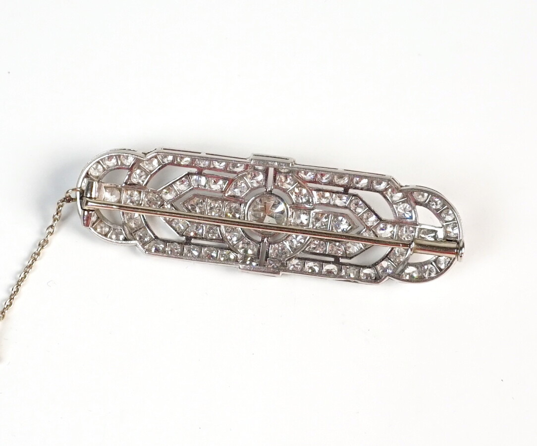 Broche "Plaque" de style Art-Déco en platine (950/oo) et or gris (750/oo) ornée au centre d'un diamant rond taille ancienne serti clos, pesant 0.7 ct environ, couleur supposée I/J, pureté SI, dans un entourage ajouré pavé de 84 petits diamants ronds taille ancienne et demi taille pour 3.3 cts au total, fermoir breveté SGDG, circa 1950-1960, L. 5.5 cm.