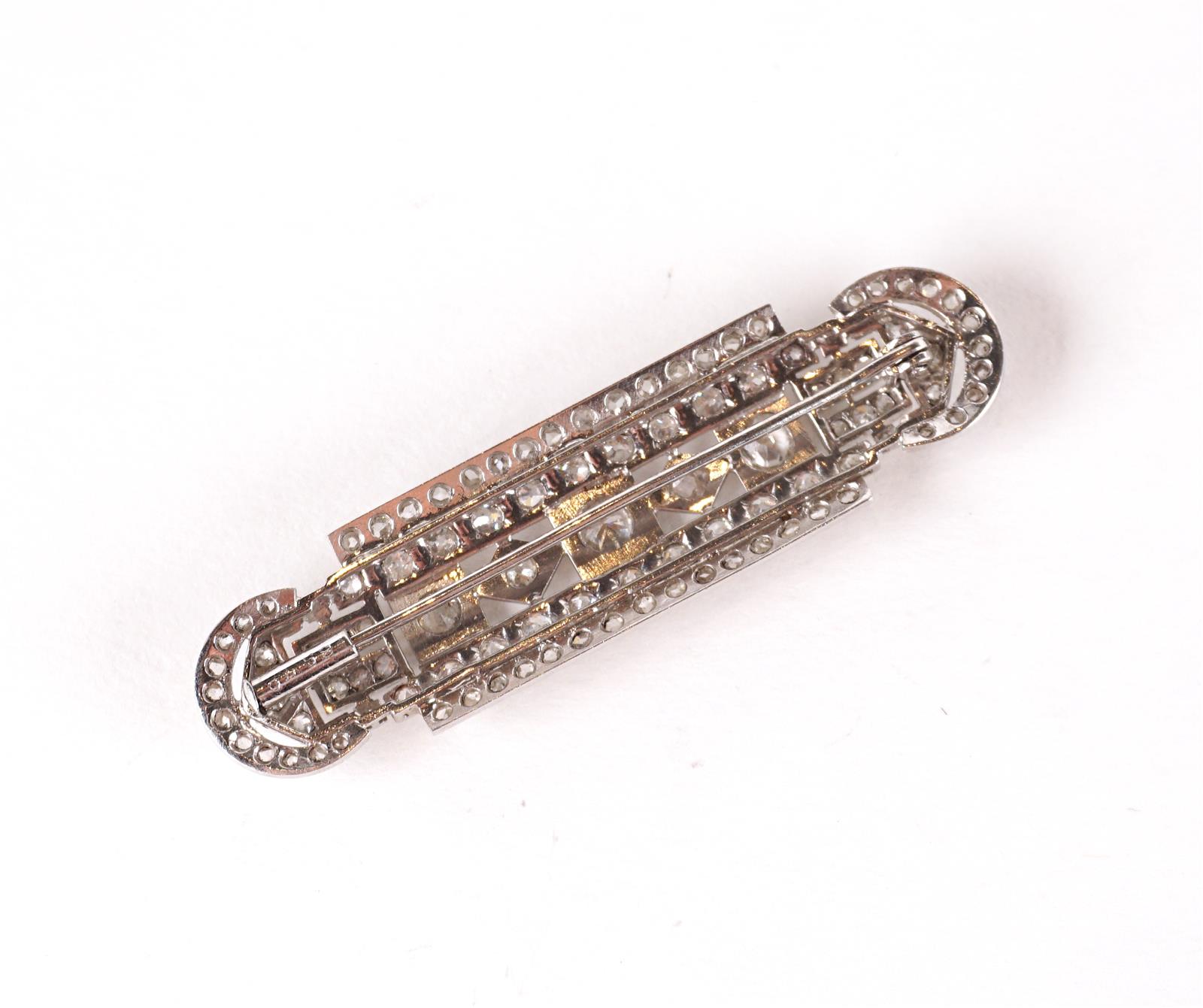 Broche plaque en platine (850/oo) à décor géométrique sertie de diamants taille ancienne, époque Art Déco. Poids brut : 11,6 g environ.